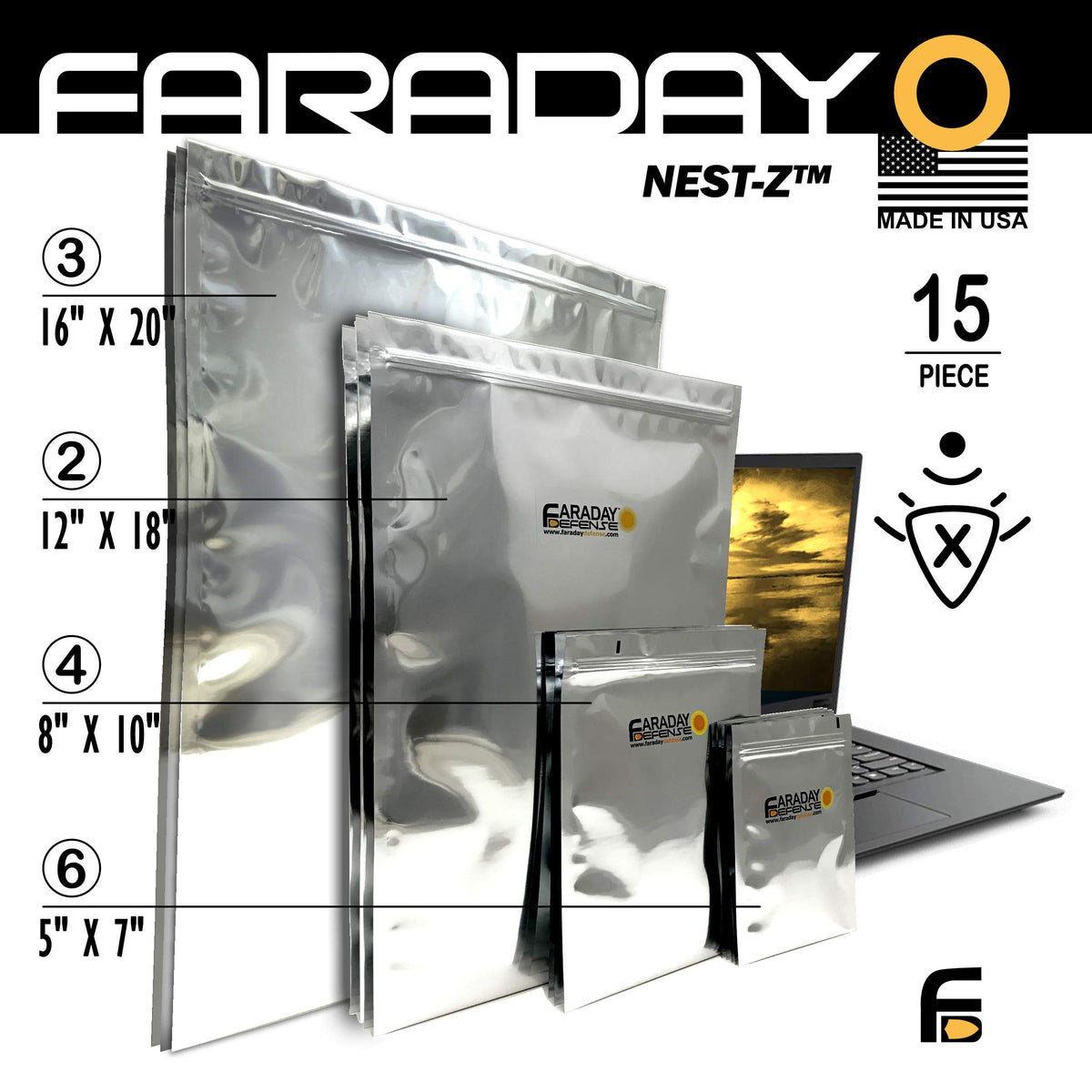 Faraday Defense 15Pc Kit Nest Z Faraday Bag Emp/Solar Flare Prepper Ultra Thick Military Grade Design, Superior Shielding Perf
