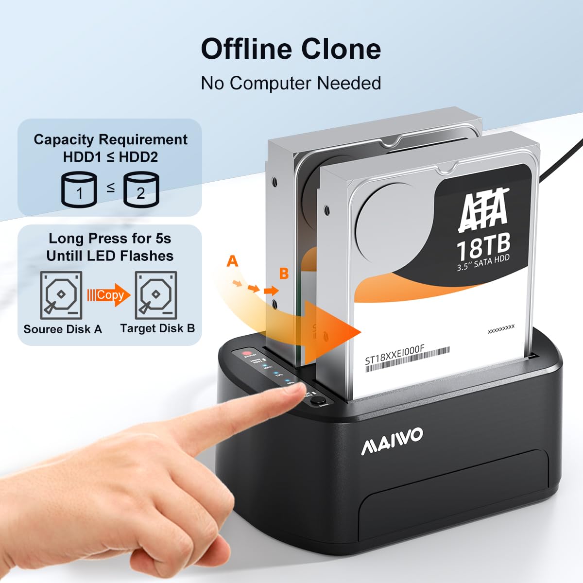 Maiwo External Hard Drive Docking Station With Offline Clone For 2.5/3.5' Sata Hdd/Ssd, 5Gbps With Uasp, 44Tb Capacity, Dual Bay Usb 3.0 To Sata Adapter Duplicator
