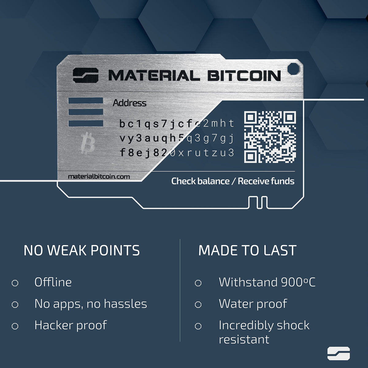 Elevate The Security Of Your Bitcoin Savings With The Material Bitcoin Cold Wallet. Unhackable And Durable, This Military-Grade Wallet Is Fire, Shock, And Flood-Resistant. It Comes With A 100-Year Warranty, Eco-Friendly Options, And User-Friendly Features. Upgrade With Portable Or Clone Options. Material Bitcoin Offers Easy Bitcoin Deposit And Withdrawal Tutorials. Your Bitcoin, Your Security - Material Bitcoin Hardware Wallet, Your Trusted Investment. Frequently Asked Questions What Is A Bitcoin Cold Wallet? A Bitcoin Cold Wallet Is An Offline Storage Solution For Your Bitcoins, Providing Protection Against Online Scams And Thefts By Keeping Your Assets Disconnected From The Internet. What If I Already Have Bitcoin? No Worries! You Can Easily Transfer Your Existing Bitcoins To Our Bitcoin Cold Wallet From Any Exchange. Our Free Personalized Support Service Is Available To Guide You Through The Process Step By Step. Why Use A Cold Wallet For Storing Bitcoins? Storing Bitcoins On Exchanges Poses Risks Like Private Key Thefts And Account Hacks. A Cold Wallet Provides A Secure Alternative, Especially For Long-Term Storage Or Substantial Bitcoin Holdings, Minimizing Such Incidents. How Does Material Bitcoin'S Cold Wallet Work? Our User-Friendly Cold Wallet Simplifies The Process For Non-Tech Users. Acquire The Wallet, Deposit Bitcoin By Scanning The Qr Code, And Your Assets Are Securely Stored, Away From Potential Dangers. How To Withdraw Bitcoins From The Wallet? Withdrawals Are Straightforward Using A Wallet Manager Like Exodus. Follow Our Comprehensive Tutorial For Easy Steps. Keep In Mind That Connecting Your Cold Wallet To Your Computer Requires A Secure Environment. Why Choose Material Bitcoin'S Wallet? Material Bitcoin Offers A Unique Advantage With Its Ultra-Resistant Steel Plate, Devoid Of Electronic Components. Waterproof, Fireproof, And Shockproof, It Requires No Updates. Store It Securely, Guarding Your Private Key For Unparalleled Protection.