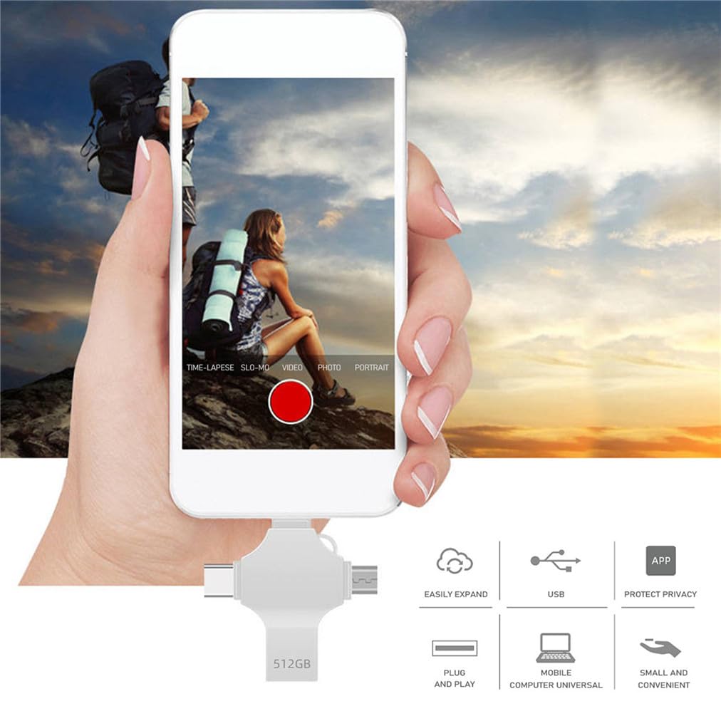 Specification:Capacity: 512Gbmaterial: Metalcolor: Silverinterface: Usb3.0+Smartphone Port+Micro Usb+Type Cpackage Included:1 * Usb Flash Drive 512Gb1 * Instrutionsmultifunctional Four-In-Onemulti-Interface Design, The Usb Flash Drive Is Compatible With Smartphones, Computers, Pcs, Android And Type C Port Devices, And Can Transfer And Share Data Between Various Devices To Easily Complete Data Sharing.One-Click Backupmanage Files, Contacts, Pictures And Videos Through The Mobile App And Quickly Back Them Up To A Flash Drive. Easily Back Up And Manage Your Files On The Go With Just One Click.Privacy Protectionsetting A Password And Touch Id Can Encrypt File Information In The App. You Can Encrypt Some Files Or The Entire Storage Space To Protect Your Privacy.How To Use?Ios Devices: Open The App Store ,Search And Download The Application ''Coodisk'' To Use It.If The Usb Flash Drive Cannot Be Recognized After Being Inserted, Please Try Inserting It Multiple Times, Or Try Inserting The Front And Back Sides Of The Usb Flash Drive. If The Usb Flash Drive Is Still Not Recognized, Try The Following Steps: Exit All Applications > Uninstall Coodisk > Restart Your Phone And Re-Download The App ''Coodisk'' > Try Inserting The Usb Flash Drive.Android: Android Phones Need To Support Otg Function. Turn On The Otg Connection And You Can Find The External Usb Storage Device In The ''File Manager'' App Of Your Phone. (No Need To Download App)Notice:After Using The Photo Stick, Be Sure To Close The Applications Related To The Flash Drive And Then Gently Pull Out The Usb Flash Drive To Avoid Damage To The Files In The Usb Flash Drive.During The Transfer Process, Do Not Pull Out The Usb Flash Drive To Avoid Transfer Failure And Damage To The Flash Drive.Data Formats Supportedfile: Doc / Ppt / Xls / Xlsx / Pdf / Html /Txt / Tximage: Jpg / Jpeg / Png / Gif / Bmp / Tif / Tiffmusic: Mp3 / Wma / Wav / M4A / Aac / M4R / Ogg / Caf / Aiffvideo: Mov / Mpg / Vob / Wmv / Rmvb / Avi / Mp4 / Mkv / Flv / 3Gp / Rm