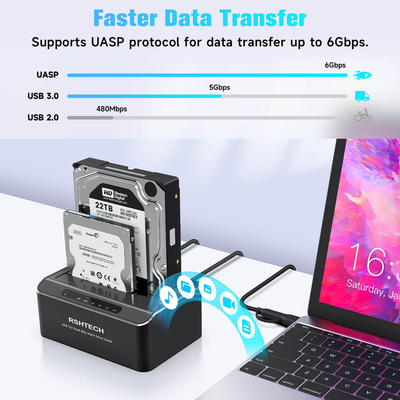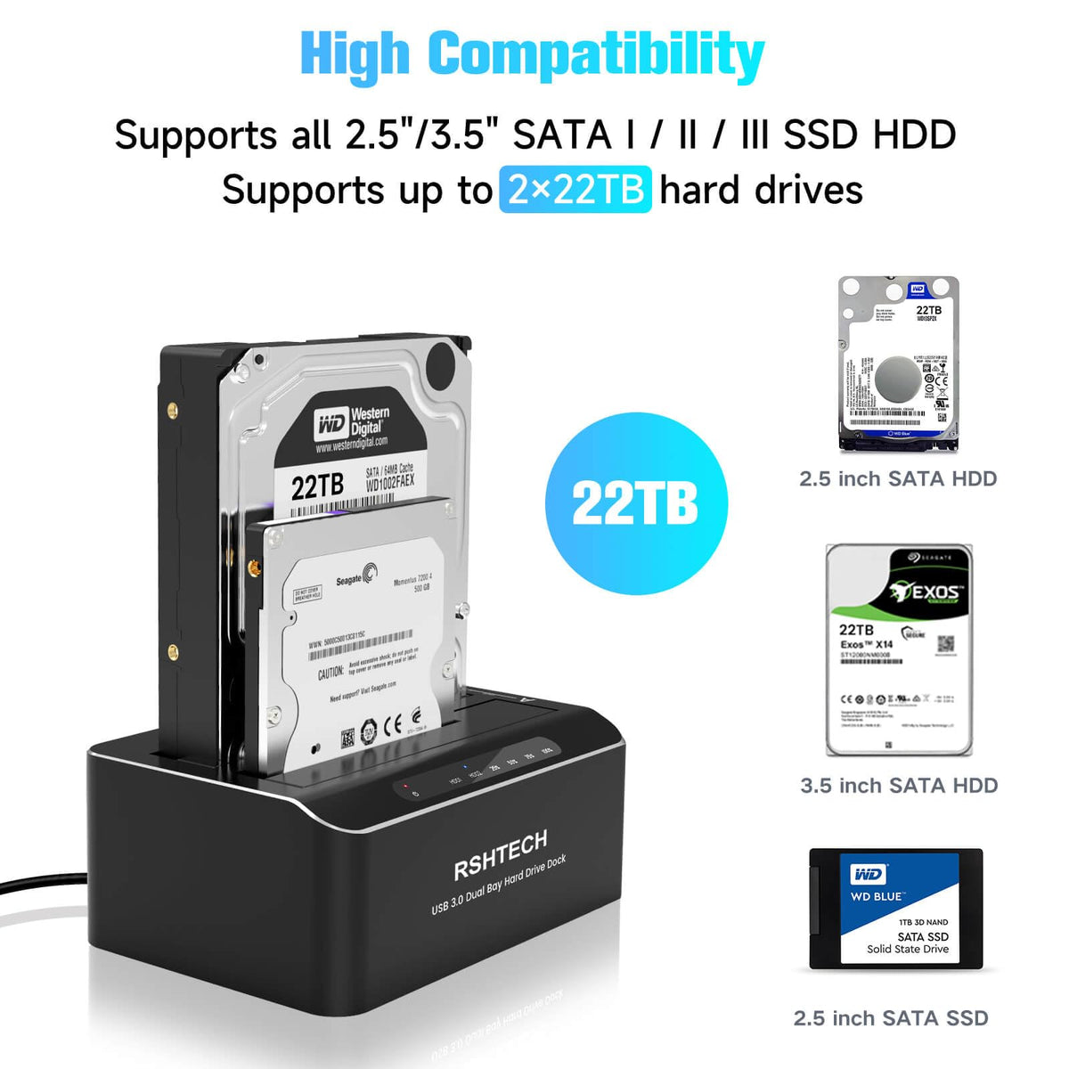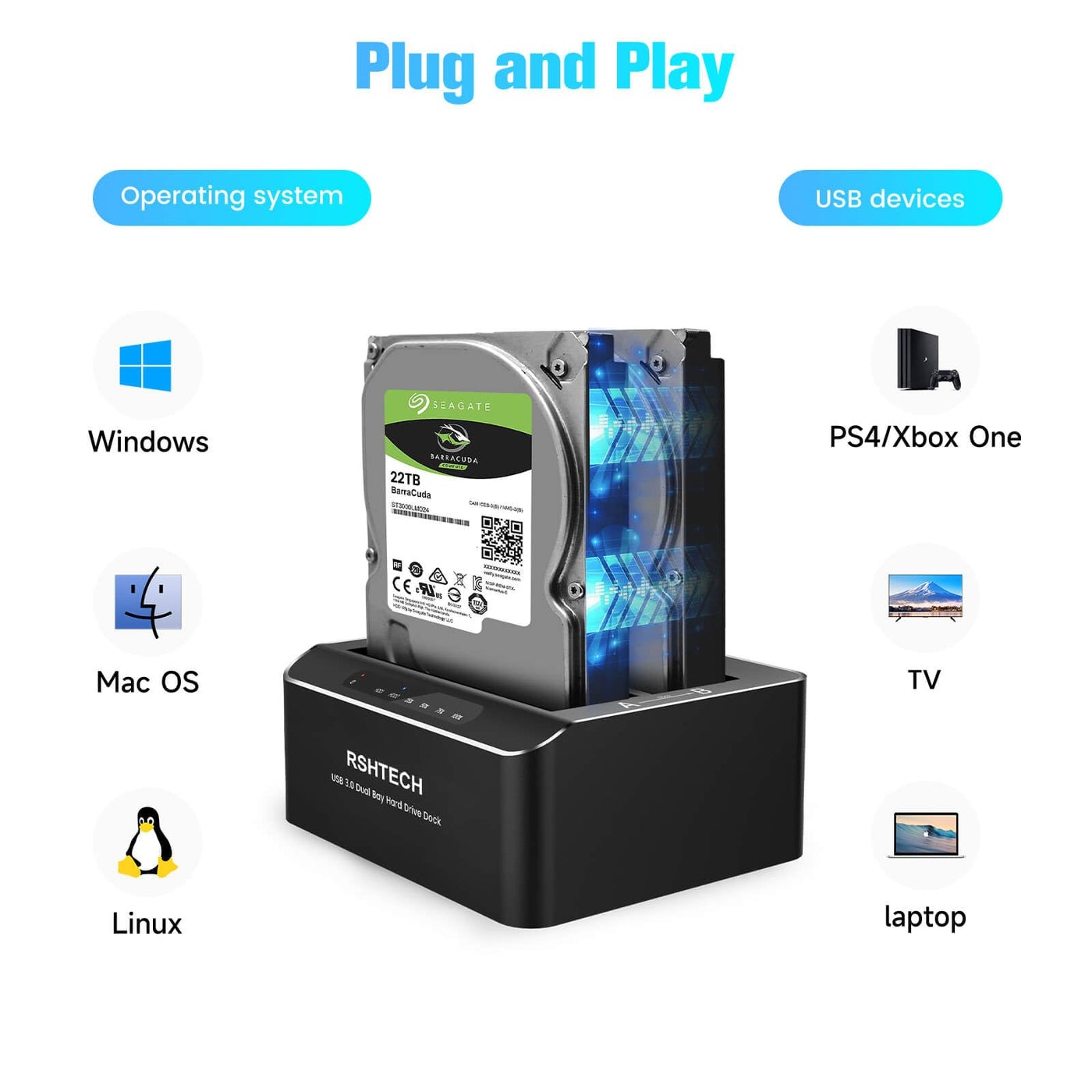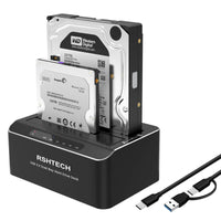 Rshtech Dual Bay Sata Usb C/Usb 3.0 Hard Drive Docking Station Is The Perfect Solution For Data Transmission, Batch Processing, Backup, Cloning, Etc. Tool-Free Installation, Plug And Play. Features: -Supported Standard 2 X 2.5''/3.5'' Sata Ssd And Hdd Up To 22Tb. -3.3Ft Type-A/Type-C Detachable Cable, Is Highly Compatible With Desktops, Laptops And More Hosts With Usb-A, Usb-C Or Thunderbolt Ports. -Compatible Device: Laptop, Pc, Ps5, Ps4, Ps4 Pro, Xbox 360, Xbox One, Smart Tv, And More. -Operating Systems: Windows 11/10/8/7, Mac Os 9/10 (And Above), Chrome Os, Linux, Android. -Data Transfer Up To 5Gbps, Support Uasp Technology Up To 6Gbps. -Offline Clone Feature, It Can Be Used To Clone An Existing Hard Drive Without Connecting To A Computer, Easy To Duplicate Data From One To Another Hard Drive. -Auto-Hibernate Feature, Entering Sleep Mode After 10 Minutes Of Data Access Inactivity. -Independent 36W(12V/3A) Power Supply With Over-Voltage And Over-Current Protection Ensures Safer Data Transfer And Hard Disk Access. -Aluminum Housing And Semi-Open Design Provides Better Heat Dissipation And Shock Resistance. -Led Indicators To Show Power Status And Hard Drive Activity Status.