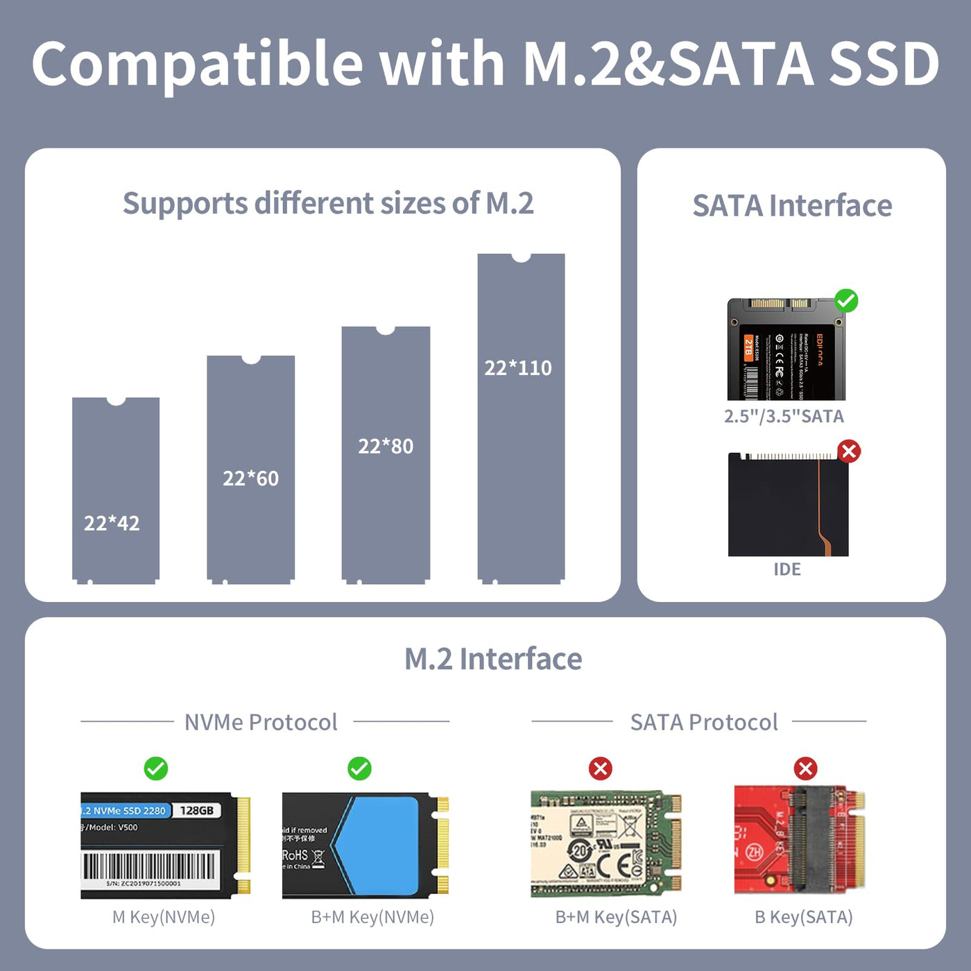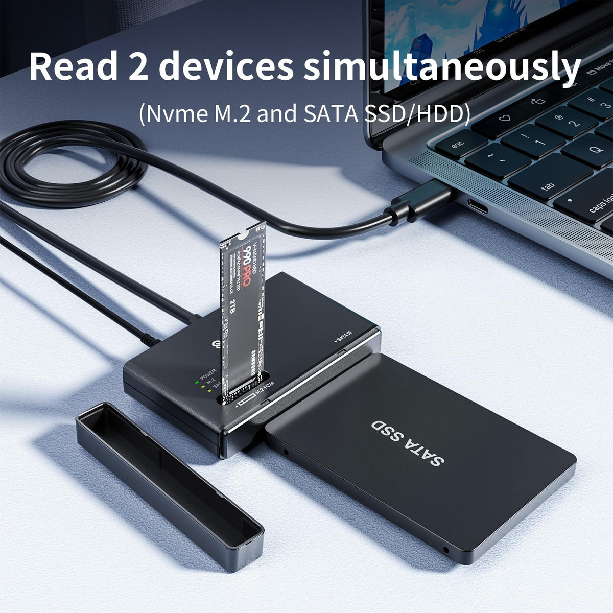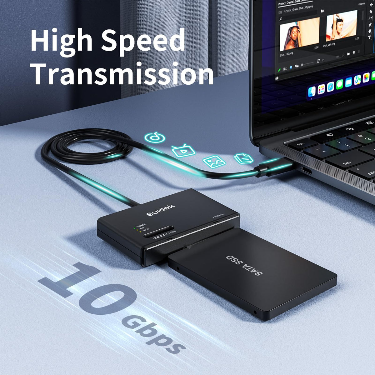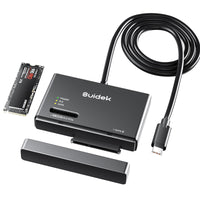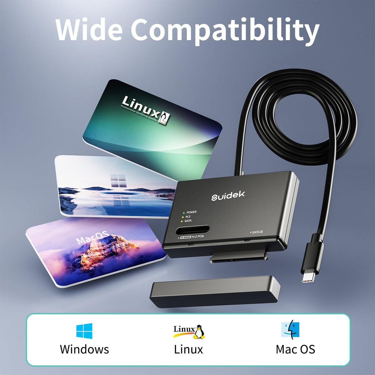 ?Wide Compatibility?The Suidek Nvme M.2 To Usb-C Adapter Not Only Functions As An M.2 Ssd Reader But Also Supports 2.5'' And 3.5'' Sata Iii Ssds & Hdds. Its Open Design Accommodates M.2 Drives Of Any Size, Ideal For Users Managing Multiple Hard Drives That Need Frequent Swapping. ?10Gbps M.2 Nvme Enclosure?This External M.2 Ssd Reader Features A Usb-C Interface For Stable And Efficient Data Transfer, Achieving Theoretical Speeds Of Up To 10Gbps For Nvme And 6Gbps For Sata. Transfer A 4K Hd Movie Or Large Files In Seconds. It'S Backward Compatible With Usb 3.1 And Usb 3.0. ?Easy Operation For Nvme M.2 Ssd To Sata Hdd Adapter?No Tools Or Drivers Needed. Simply Insert Your M.2 Nvme Ssd Or 2.5''/3.5'' Sata Ssd/Hdd Into The Appropriate Slot, Connect The Usb-C Cable To Your Computer, And It'S Ready To Use. Led Indicators Light Up To Show Activity. ?Comprehensive Safe Protection For Your Ssd?The Nvme M.2 Dock Features A Vertical Design For Effective Heat Dissipation During High-Speed Operation. It Includes Over-Voltage And Over-Current Protection, Supports Ssd Trim Commands, And Offers Uasp Acceleration For Enhanced Read And Write Speeds. The Adapter Automatically Enters Sleep Mode After 30 Minutes Of Inactivity. ?What You Get?Includes A Type-C To Sata/M.2 Enclosure Adapter And A 12V/2A Power Adapter. Compact And Portable, Perfect For Office Workers, Gaming Enthusiasts, And Travelers Managing Multiple Hard Drives. ?Attention?Please Remove Any Thick Heat Sinks From Your M.2 Ssd Before Use. If Your M.2 Ssd Uses Encryption, Disable It Before Connecting. Note That This Nvme Ssd Reader Does Not Support Cloning Between Sata And M.2 Hard Disks.