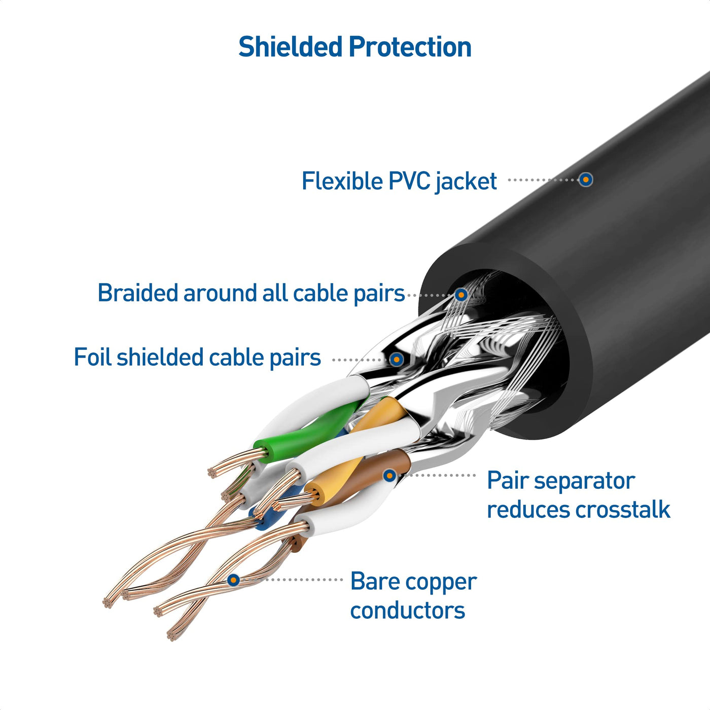 Q: What kind of shielding does this Ethernet cable have, and how does it benefit performance?A: The Cable Matters Cat 6A Ethernet cable features SSTP/SFTP (Screened Foiled Twisted Pair) shielding, which helps prevent electromagnetic interference (EMI) and reduces crosstalk noise, ensuring a stable and high-quality connection.