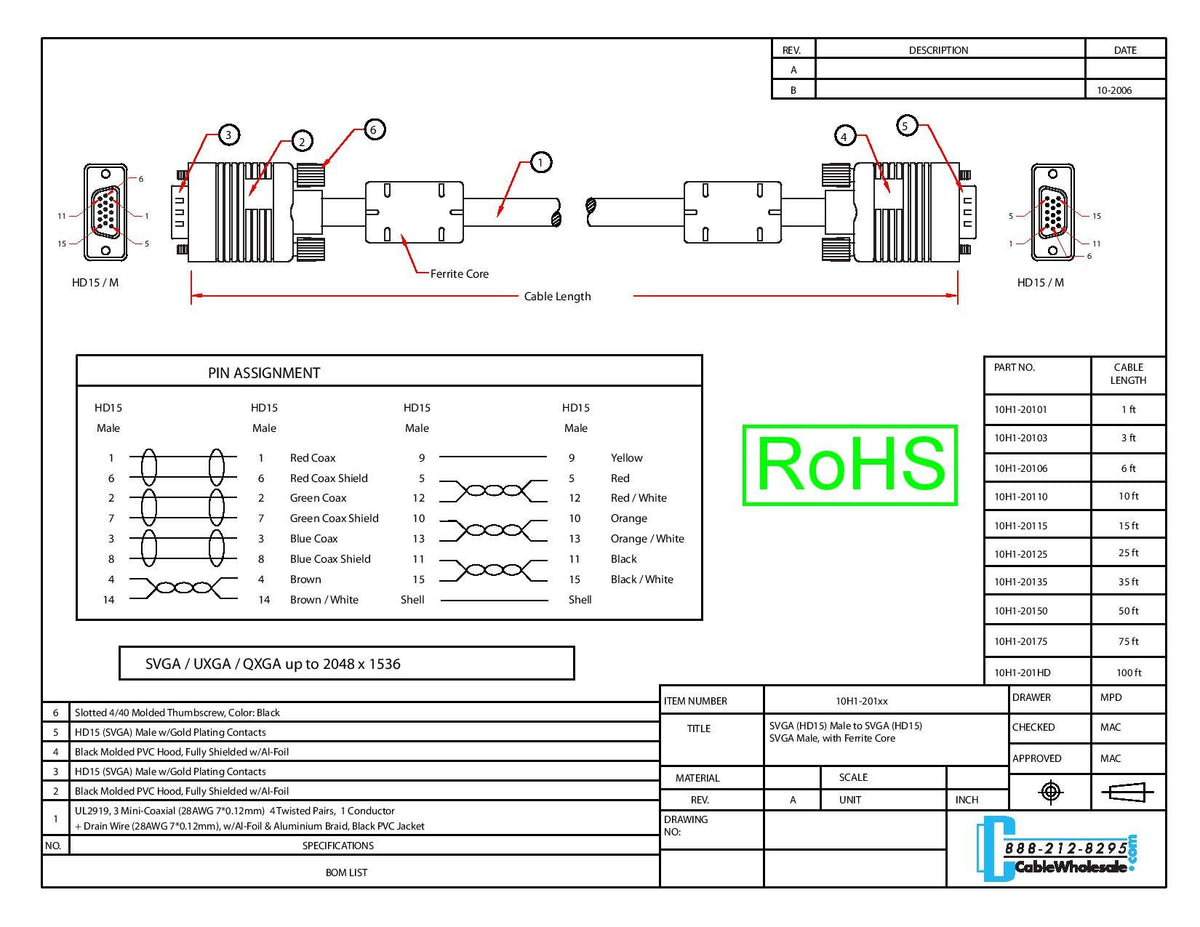 Svga Cable With Ferrites, Black, Hd15 Male, Coaxial Construction, Double Shielded, 3 Foot