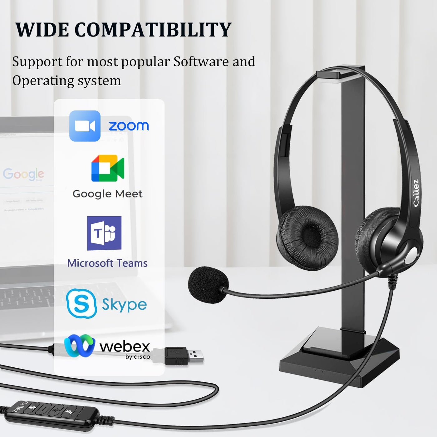 ?Wide Compatibility?The Usb Connection Works On A Variety Of Devices. Compatible With Windows 2000/7/8/10/Xp/Vista, Mac Os X And Most Of The Leading Uc Platforms, Softphone. Perfect For Classroom, Home, Office, Call Center, Skype Chat, Online Courses, Conference Calls, Webinar, Zoom And More. ?Easy To Use?Plug And Play, No Drivers Required. Callez Usb Headset Features A Convenient In-Line Control That Allows You To Easily Adjust The Volume, Mute/Unmute Microphone. The Red Led Indicator Will Notify You If The Microphone Is On Or Off. ?Super Clear Calls?Callez Usb Headphone With Dsp Technology For Clear Conversations, The Noise Cancelling Microphone Reduces Unwanted Background Noise While Speaking Or Recording. Flex Boom Mic Can Be Positioned To Pick Up Your Voice Clearly. ?Long-Lasting Comfort?Computer Headset Features An Upgraded Adjustable Headband That Fit All Head Sizes Comfortably. Soft Leatherette Ear Pads And Lightweight Design Ensure All-Day Wearing Comfort. ?Excellent Durability & 2-Year Warranty?Designed With High-Quality Materials And Uni-Body Headband Construction, Wired Pc Headset Is Durable And Sturdy. We Offer 45 Days Money Back And 24 Months Hassle-Free Service For Our Computer Headphone. Please Don'T Hesitate To Contact Us If You Have Any Questions Or Need Any Support.