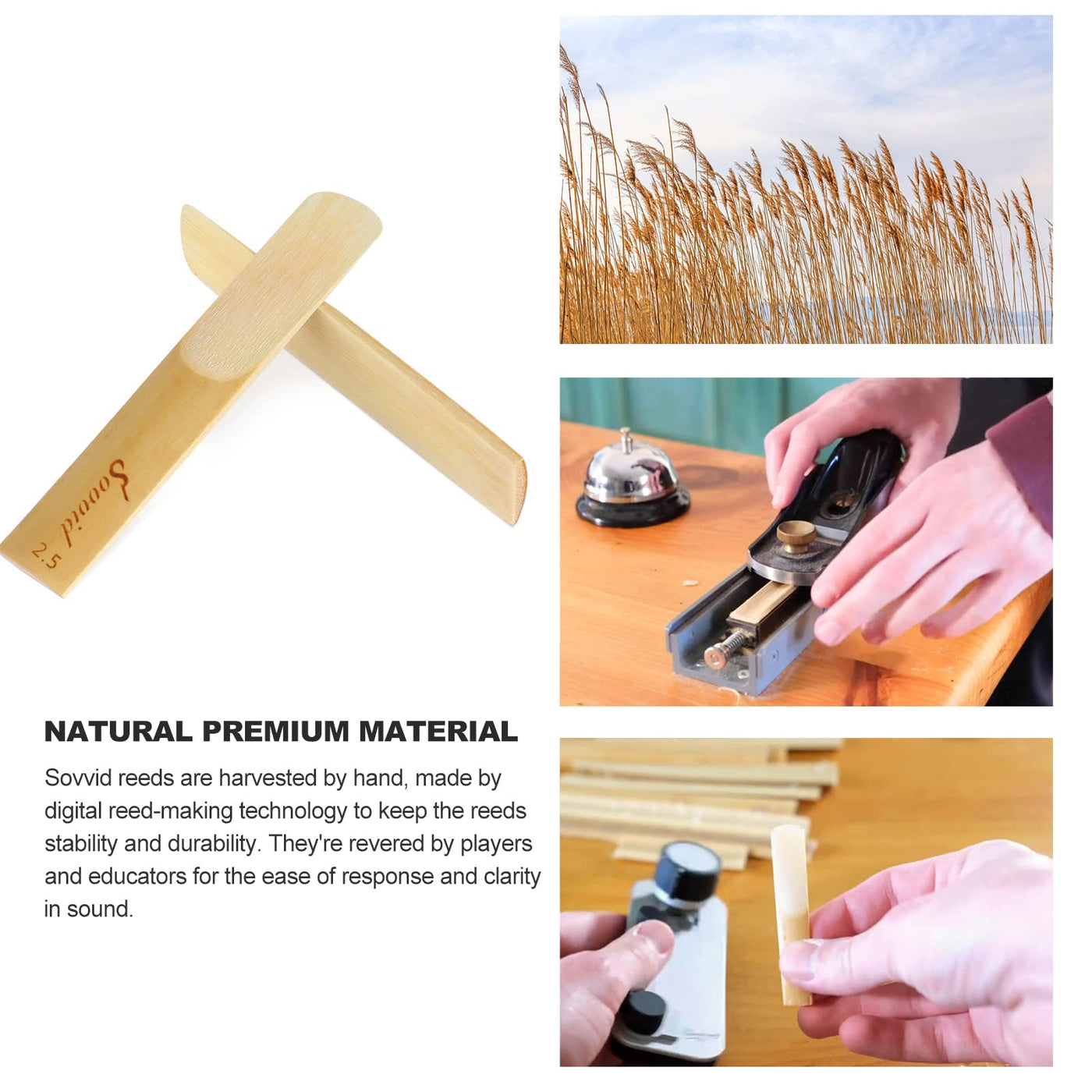 Q: What makes Sovvid clarinet reeds different from other brands?A: Sovvid clarinet reeds feature a thinner vamp and unfiled cut, which enhance playability and produce a clearer sound. They are also made from high-quality natural reeds harvested by hand.