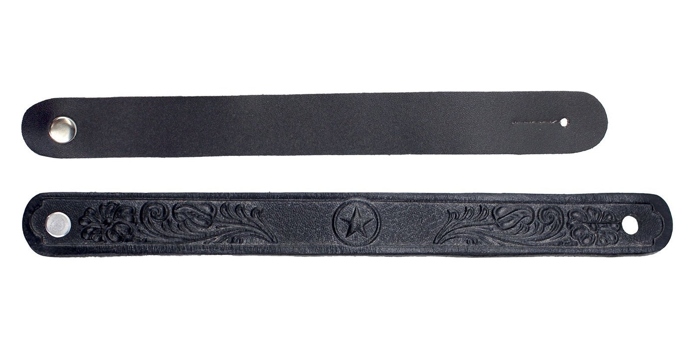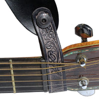 Walker & Williams At 2 Black Carving Leather Acoustic Guitar Strap Button Headstock Adaptor For Acoustic, Electric, And Bass Gui