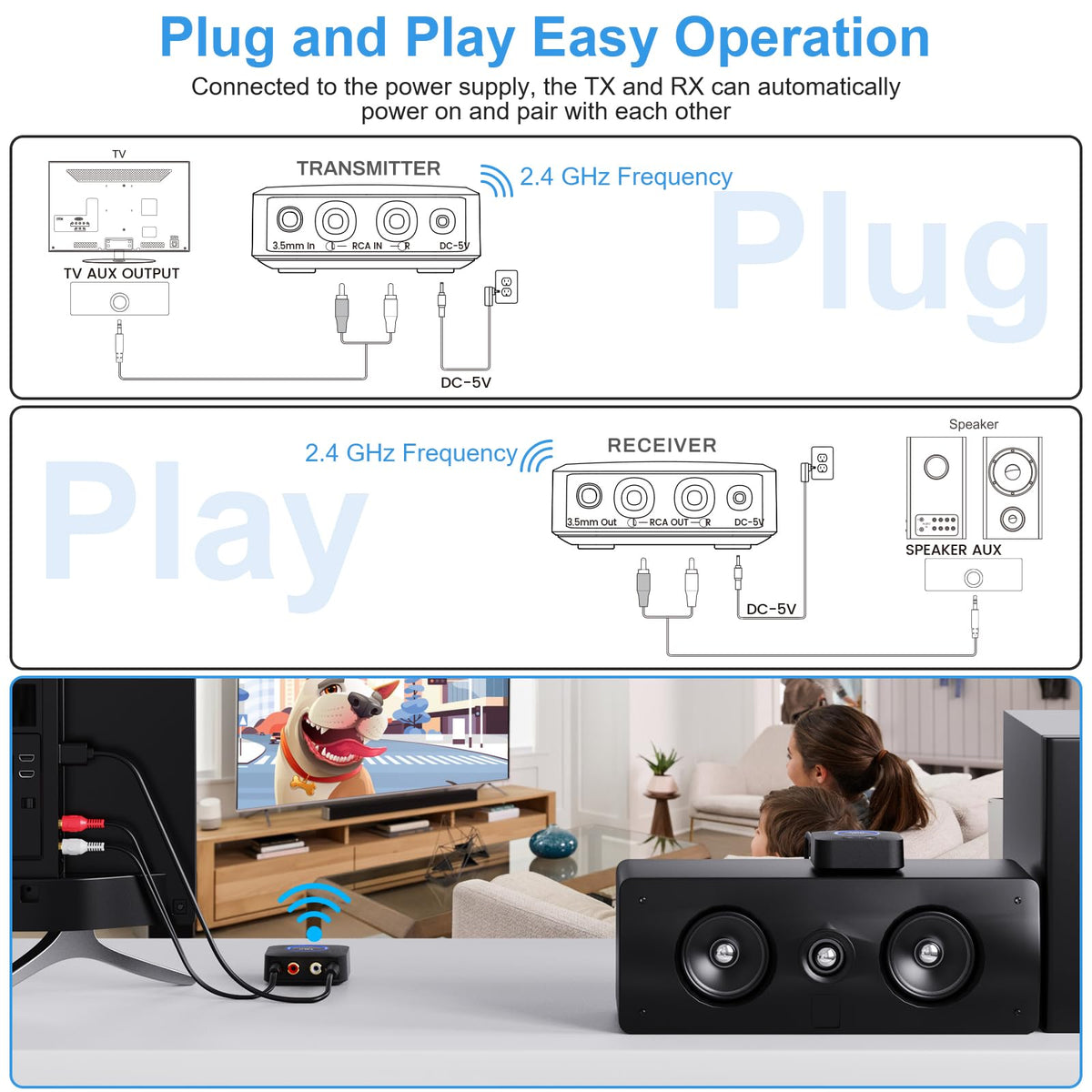 ?Quick Connection?The 1Mii Wireless Audio Adapter Connection Is Quicker And More Stable Than Older Versions. After Connected To Power, The Transmitter And Receiver Will Automatically Power On And Enter Paring Mode And There Is A Blue Ring Light To Indicate Its Working State, Hands Free For Audio Entertainment. No More Disturbing Disconnection And Manual Re-Connection.