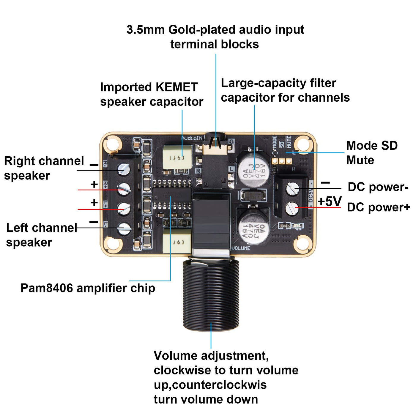 Features: Amplifier Type Can Be Connected To Select Functions. Type D For High Power, Type Ab For Low Power, Factory Default Is High Power. External Shutdown Can Be Added, Sd: The Default Is High Power Level, And At Low Power Level, Chip Will Shut Down. Mute: Low Level Mute, Factory Default High Level. Specifications: Size: 3.2 X 5.5 Cm/ 1.26 X 2.17 Inchweight: 25 G Efficiency: >90%Input Method: Single-Endedgeneral Harmonic Distortion And Noise:
