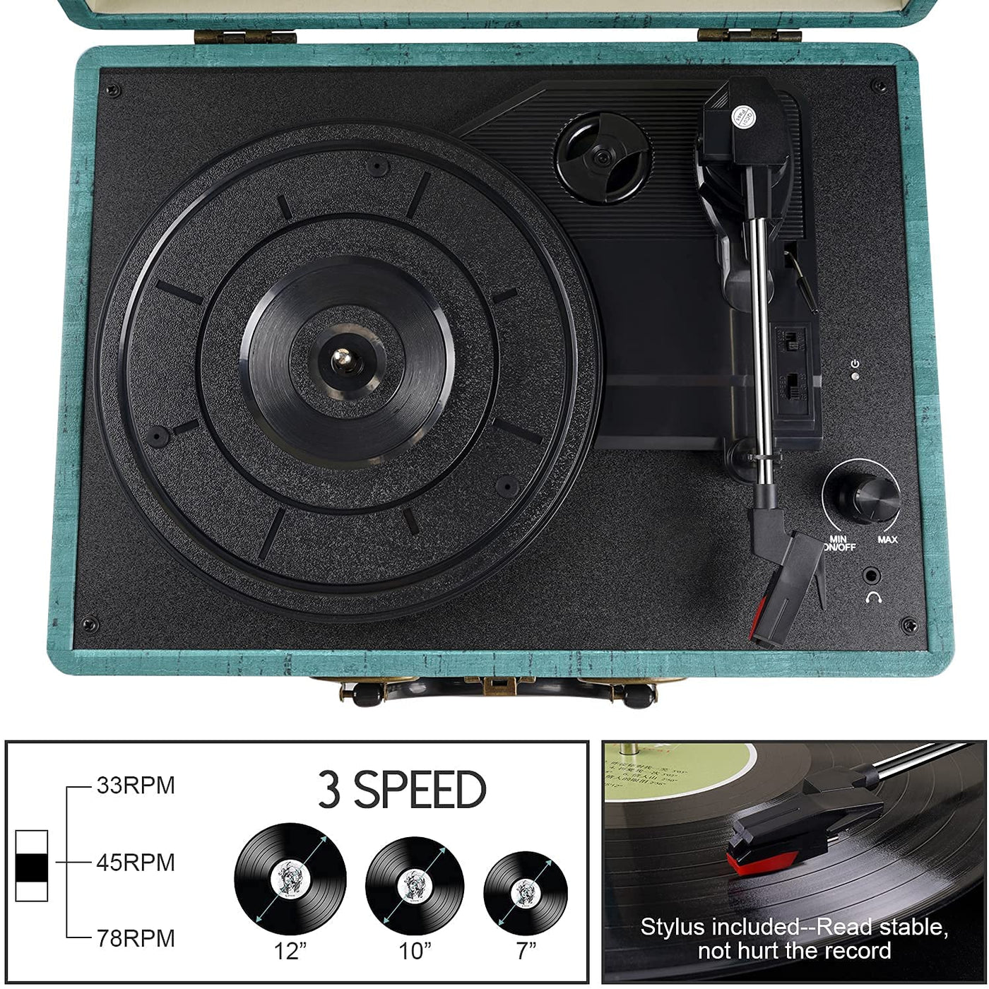 This 3-Speed Portable Bluetooth Turntable Combines Vintage Style With Modern Tech. It Boasts Built-In Speakers, Bluetooth, Rca, 3.5Mm Aux-In, Headphone Jack, And Mp3/Mobile Playback, Making It The Ultimate Portable Audio Companion.