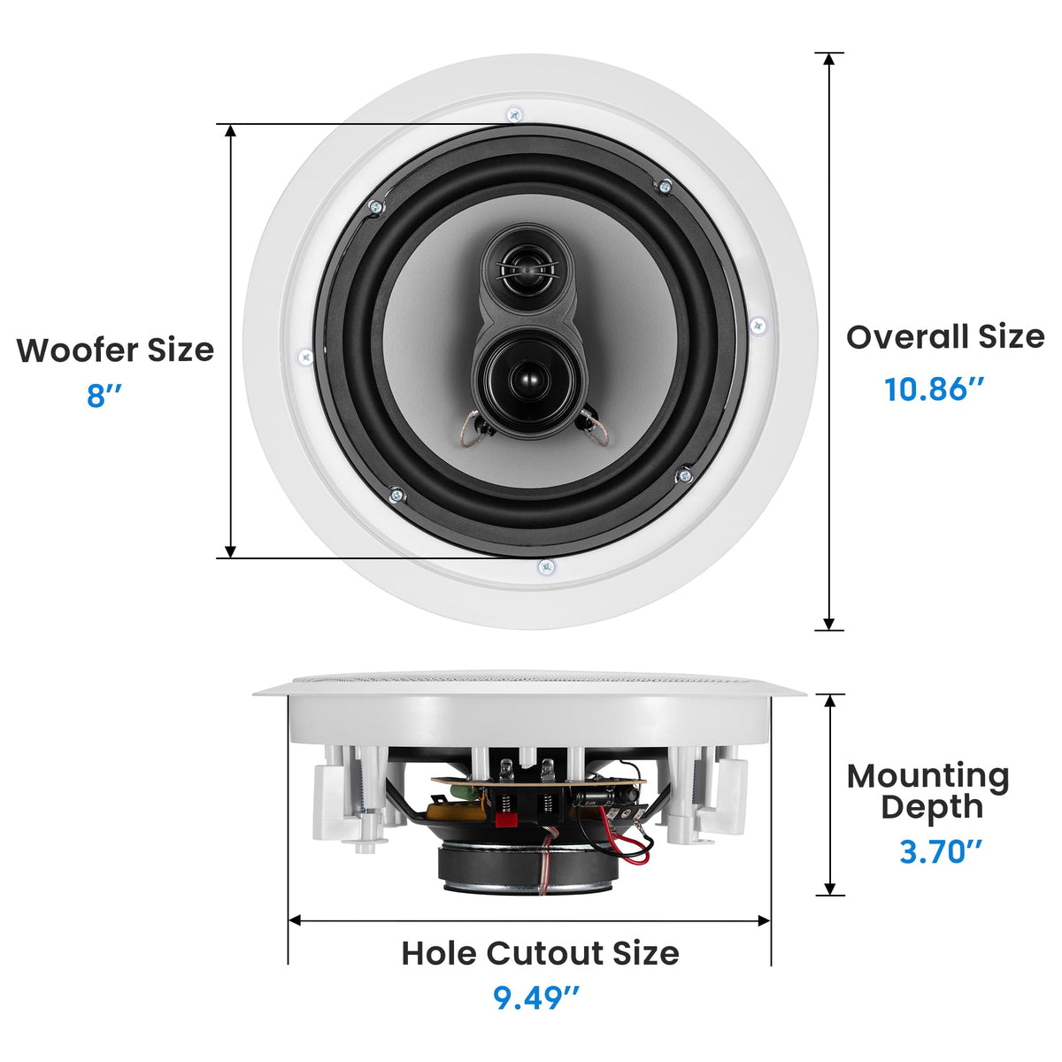 Acoustic Audio Cs-Ic83 Cinema Series 8'' In-Ceiling Surround Sound 3-Way Speakers Are Ideal For Any Home, Office Or Entertainment Area Because They Are Designed With Supreme Performance In Mind. Each Speaker Handles 350 Watts Of Power And Includes: A 8'' Poly Cone Woofer For Improved Motion And Higher Bass Response, A Butyl Rubber Surround, A Progressive Spider For Greater Control And Higher Excursion Capabilities, A Poly Mica Midrange, A 13Mm Soft Dome Tweeter For Detailed High Frequencies And A 3-Way Passive Crossover For Greater Fidelity. Spring Loaded Push Terminals Allow For Easy Connectivity And Its Low Profile Baffle Housing Was Designed For Simple Installation And An Improved Frequency Response. The White Grill Will Coordinate Well With Any Interior, Or Can Be Painted To Match Individual D Cor. Included Is A Cutout Template To Aid In The Installation Process And Full Instructions.