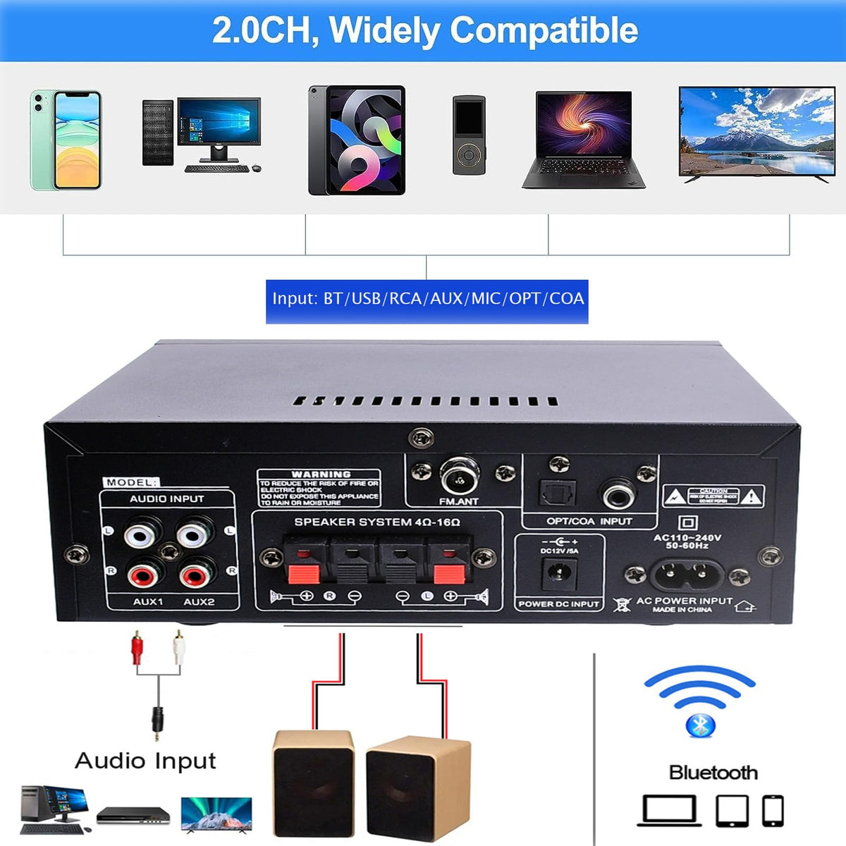Woopker Audio Amplifier Hifi Stereo Amp Speaker Bluetooth 5.0 Amp Receiver With 12V 5A Power Supply,Remote Control,Fm Antenna For Car Home Bar Party