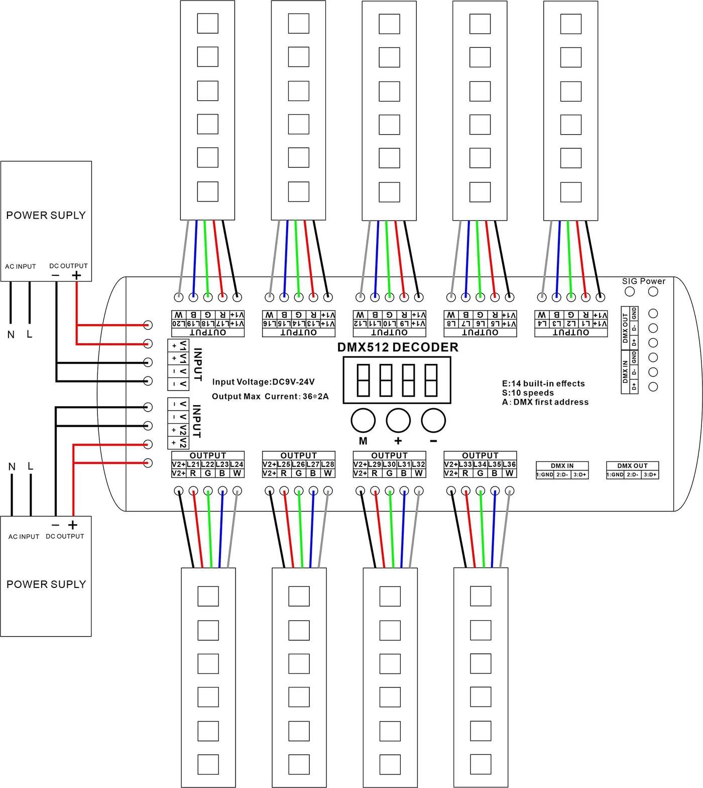 Akepo 36Ch Dmx Rgbw Led Digital Display Decoder, Dmx512 Controller For Rgbw Led Lights Dc9 24V 2A/Ch With 14 Built In Effects(36