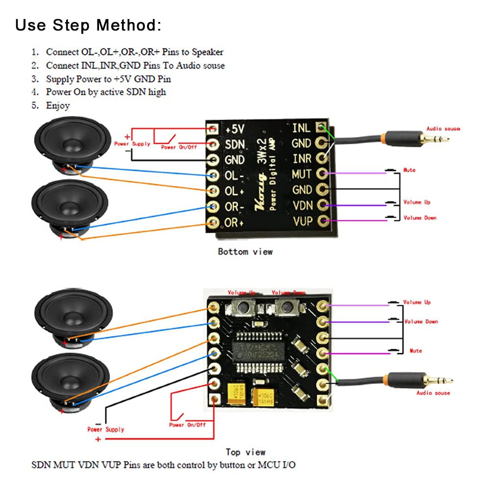 Q: Can I control the volume and mute functions remotely?A: Yes, the amplifier features a 64-step digital volume control and allows for volume adjustment, mute, and power on/off through the I/O pins, which can be controlled by a microcontroller like PIC or AVR.
