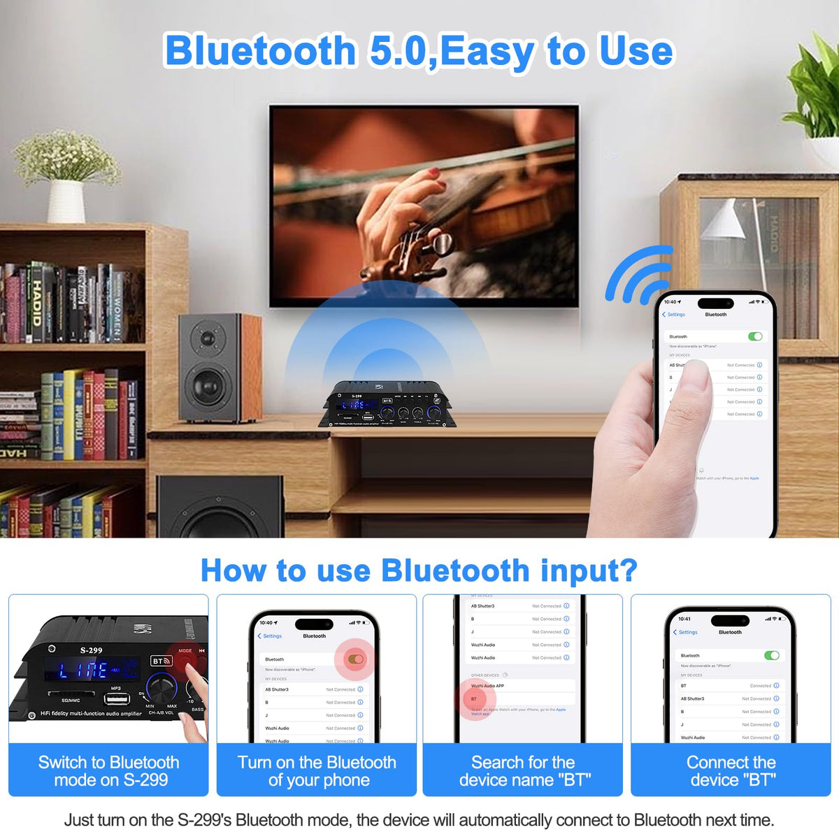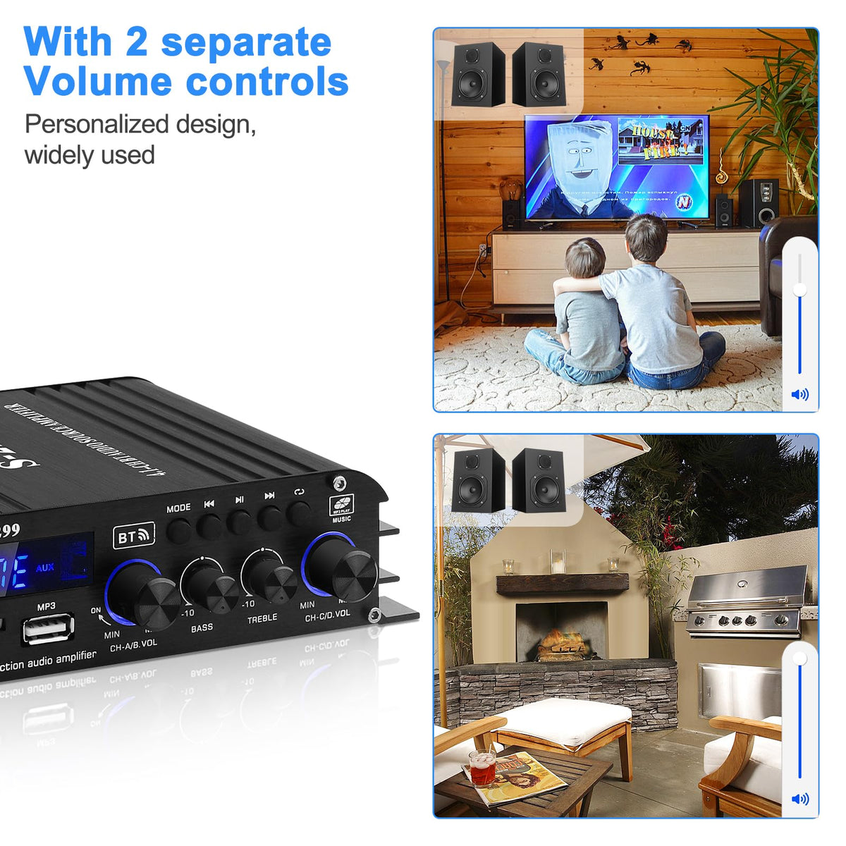 S-299 Bluetooth Hifi Audio Amplifier 4.1-Channel Bluetooth5.0 Mini Audio Power Amplifier Rms 40Wx4+50W Max 800W Power Subwoofer Amplifier Dc 12V/5A For Home Speakers With Usb Sd Slot, Aux, Fm Radio Features: 1. 4.1 Channel Amp, Stereo Output, Suitable For 40W 4-16 Inch Passive Speakers. 2. With Powerful Audio Processing Chip Distortion Rate: =0.3%, Just Little Sound Distortion. 3. Hifi Sound Quality For Perfection, You Will Enjoy A More Perfect Sound Quality Experience. 4. With Treble And Bass Control Knobs. 5. With Echo Function And Mic Input Jack. 6. With Fm Faction, The Fm Range Is 87.5-108.0Mhz. 8. Bluetooth, Rca, Usb Audio Input, U-Disk And Memory Card Reading, Plug And Play. 9. Audio From External Devices,You Can Use Mobile Phones, Computers, Tablets, Notebooks, Mp3, Mp4,Tvs And Projectors With Av Audio Etc. Connect This Amplifier 10. With 12V 5A Power Input Jack,You Can Power The Amplifier With Dc And Ac Power. Use Occasion: S-299 Audio Amplifier Is Widely Use Indoor And Outdoor, Such As Family, Party, Bar, Concert, Carnival Etc. Specifications: Product Name: S-299 Hifi Bluetooth Audio Power Amplifier Product Model:S-299 Version: Bluetooth 5.0 (5 Meters If Unobstructed) Input Sensitivity: 500Mv Signal To Noise Ratio:>80Db Audio Input: Bluetooth+Rca Channel: 2.0 Chip: Yd7377 (Am Interference Suppression Function) Adapted Speaker: