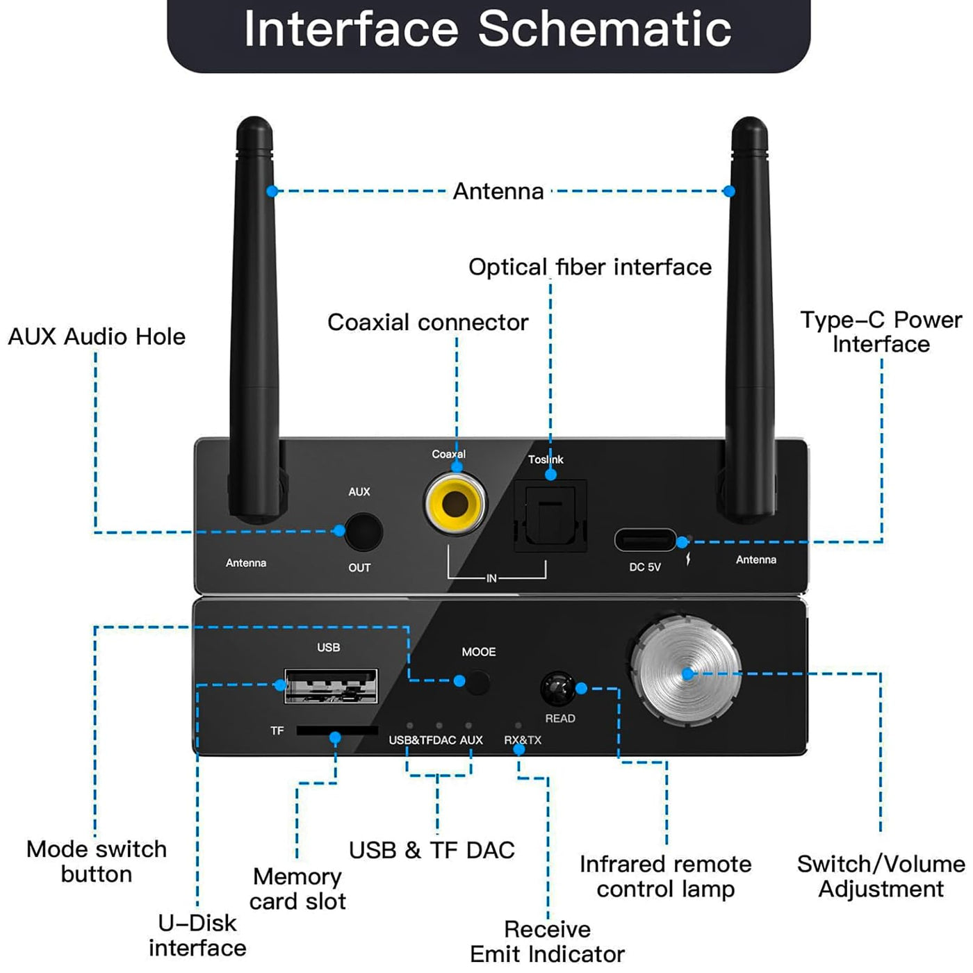 Q: Do I need to connect the Bluetooth adapter to a power source?A: Yes, the Bluetooth receiver requires a constant power supply via a Type-C port for continuous operation. It does not have a built-in battery, so ensure it is plugged in before use.