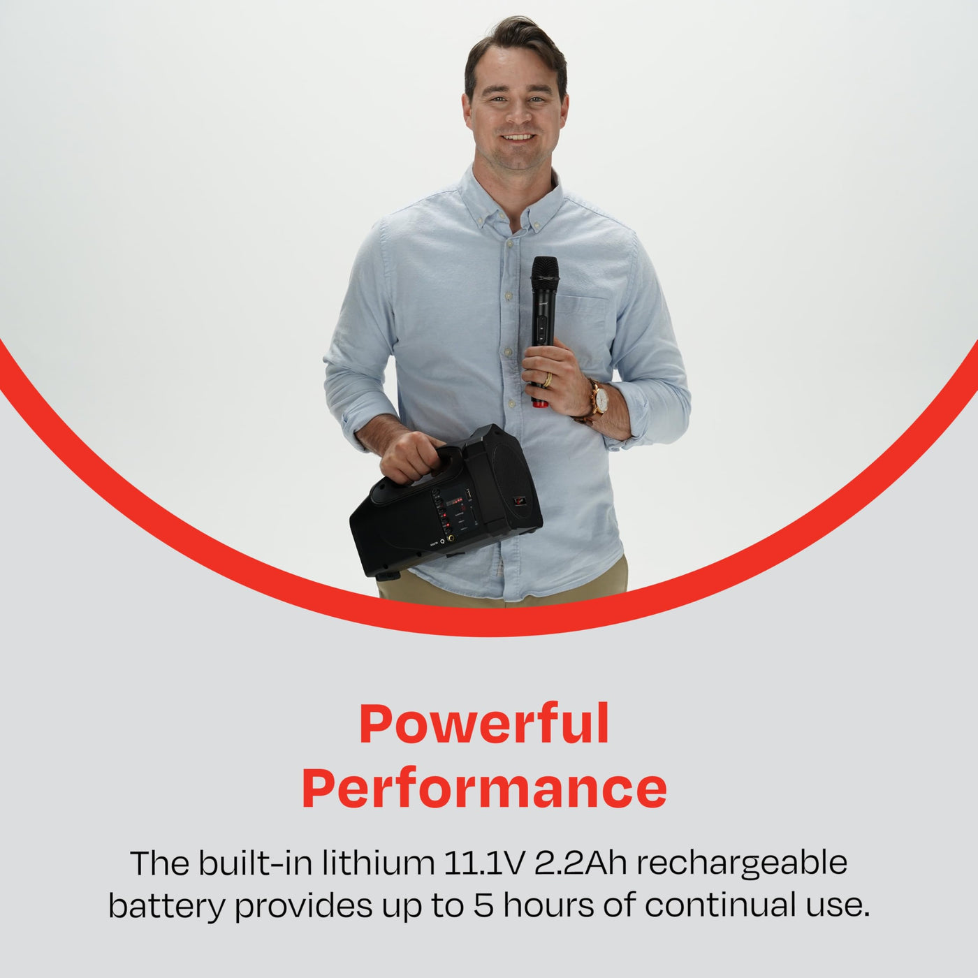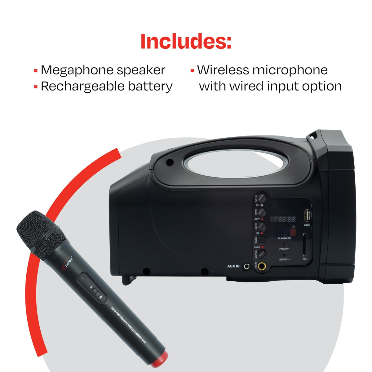 Wireless Pa System Features A 500' Audio Range To Let You Broadcast Music Or Messages So The Entire Crowd Can Hear. Wireless Microphone With A 100' Range Allows You To Roam Freely As You Talk. Rechargeable Battery Eliminates The Need For Costly Battery Replacements. Rugged Abs Plastic Exterior With A Comfy Handle Allows Easy Transportation. Microphone And Auxiliary Inputs Allow You To Play Audio From Other Sources Such As Mobile Devices. 5'' Speaker Projects Clearly To Large Audiences To Ensure Your Voice Is Heard.