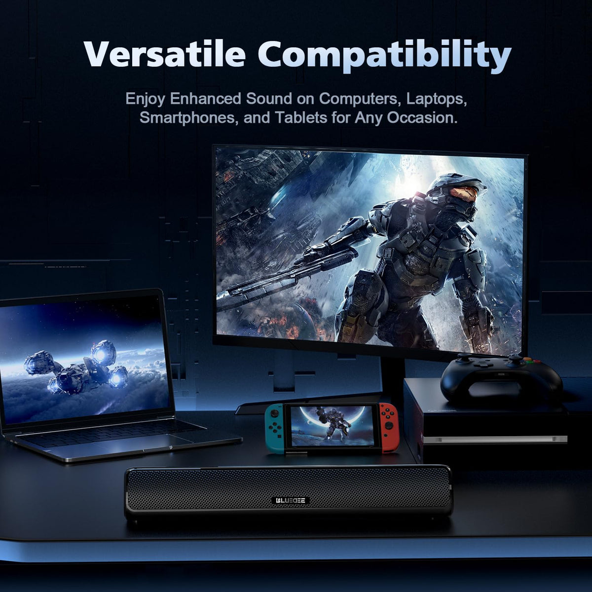 ?Powerful Performance?Bluedee Computer Speakers For Desktop Feature 20W High Power With 2 Hd Full-Range Units And 2 Tweeters, Offering Robust And Powerful Sound Quality, Great For Playing Different Styles Of Music. Plus 2 Bass Radiator Units Enhance Bass Reproduction. Vocals, Instruments, And Sound Effects Are Detailed, Serving To Enhance Every Cinematic And Gaming Moment. | ?Rechargable And Portable?The Pc Speakers That Equipped With 3600Mah Rechargeable Battery Support Working Time Max To 5.5 Hours After Fully Charged By The Charging Cable. Compact And Portable Design Perfect For Use Outdoors. | ?Do More With Connection?Support Bluetooth 5.3 Connection, 3.5Mm Aux-In Wired Connection, Tf Card Connection And Usb Flash Disk Connection. The Computer Soundbar Is Widely Compatible With Various Devices, Such As Computers, Laptops, Tablets, Monitors, Smartphones And Tv. | ?Easy To Use?The Buttons On The Side Of The Speaker Bar Make It Easy To Access Different Functions As Your Need. The Compact Design Fits Anywhere Like Living Room, Office, Study, Effectively Saving Room Without Compromising Impressive Audio Performance. | ?Trustworthy After-Sales?Once Purchased, You Are Our Valued Customer Entitled To Lifetime After-Sales Service. Should You Have Any Queries Or Require Technical Help, Contact Us Via Amazon Messages Or The Contact Information In The User Manual.