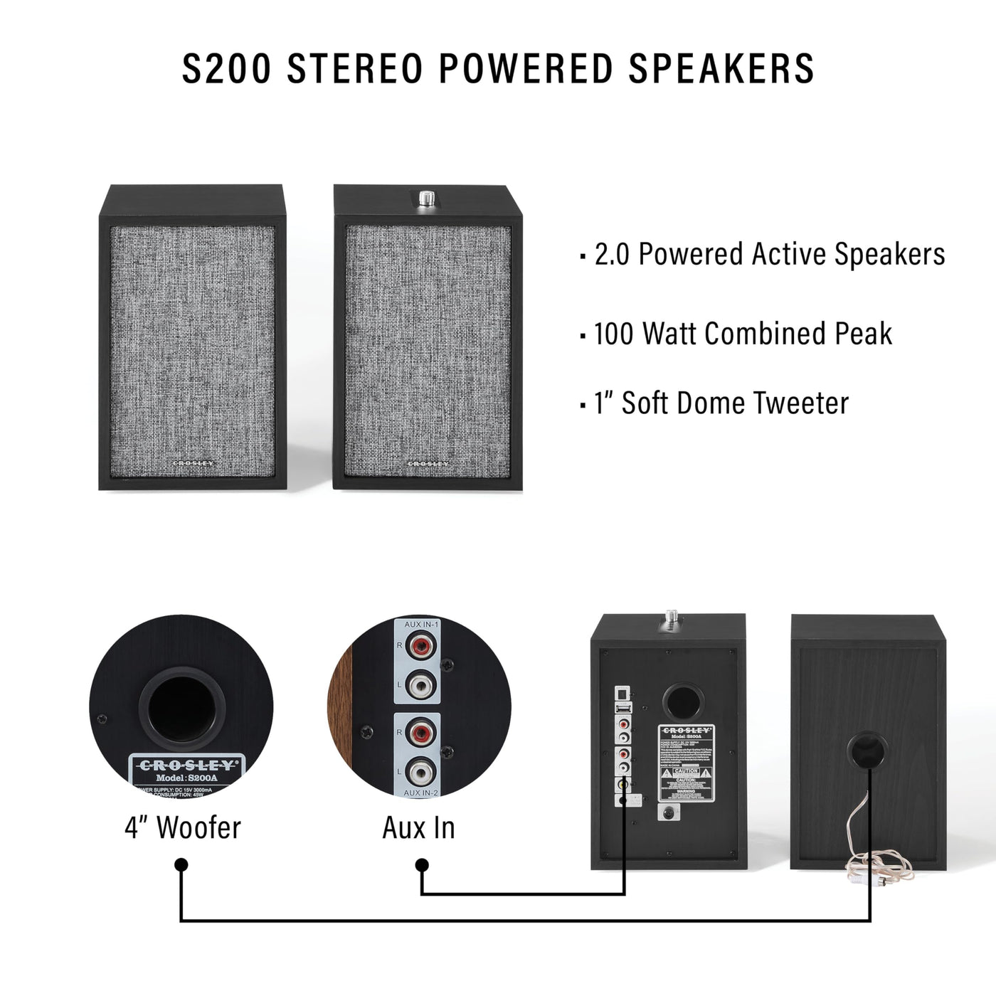 Fully Automatic Component Turntable Plays Two Speeds: 33 1/3 And 45 Rpm Records | Auto Start Button - Place On An Album, Hit The Start Button And Watch The Needle Gently Drop On The Opening Track | Built-In Bluetooth Transmitter Connects To Any External Bluetooth Speaker So You Can Clean Up The Clutter And Go Wireless | Change Speeds, Start/Stop, And Raise/Lower The Tonearm With The Four Intuitive Buttons On The Front | Included S200 Powered Speakers Each Feature A 4 Woofer Along With A 1 Soft Domed Tweeter, Driven By A 50 Watt Amplifier