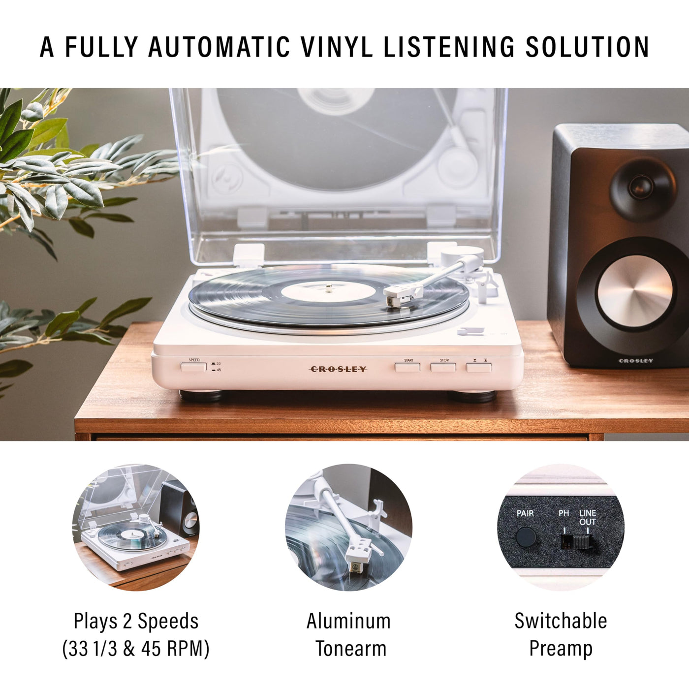 Fully Automatic Component Turntable Plays Two Speeds: 33 1/3 And 45 Rpm Records | Auto Start Button - Place On An Album, Hit The Start Button And Watch The Needle Gently Drop On The Opening Track | Built-In Bluetooth Transmitter Connects To Any External Bluetooth Speaker So You Can Clean Up The Clutter And Go Wireless | Change Speeds, Start/Stop, And Raise/Lower The Tonearm With The Four Intuitive Buttons On The Front | Rca Outputs And A Switchable Preamp Make Hooking Up To A Receiver Or Speakers A Breeze; Hinged Dust Cover
