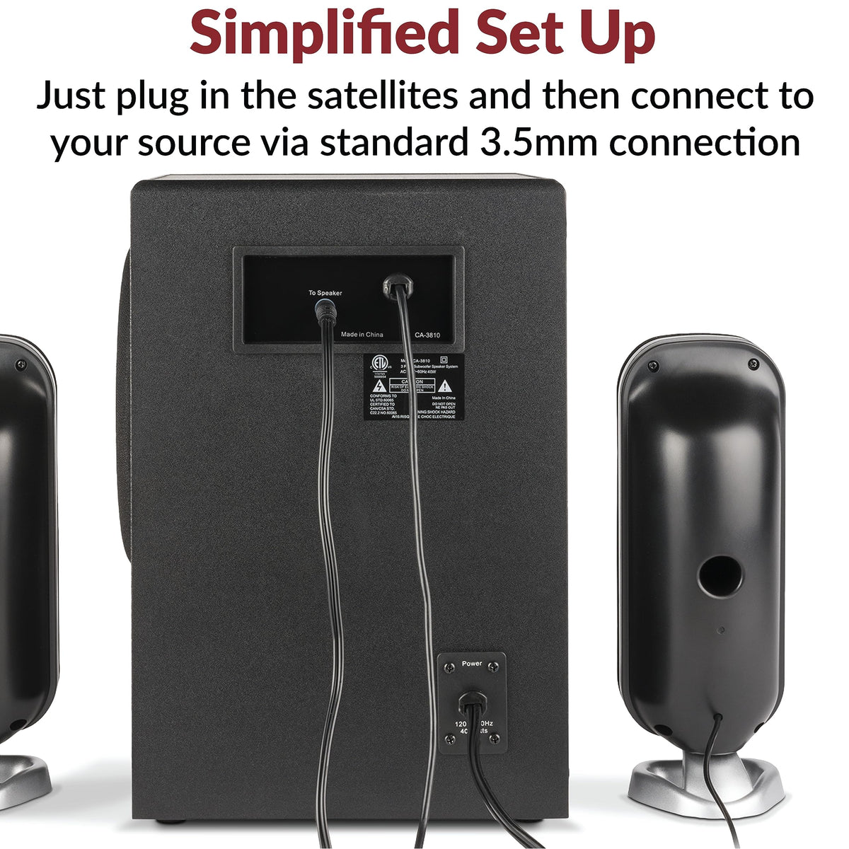 High Wattage, Powerful, And In Your Face Amazing Sound Performance. The Ca-3810 Is A 2.1 Computer Speaker System That Delivers Thunderous Bass Response With Clean And Clear Highs. Housed In An Acoustically Balanced Wood Cabinet, The Ca-3810S Subwoofer Instills A Solid, Deep Audio Experience No Matter What Youre Listening To. The System Control Pod Turns The Speaker System On And Off, While Sporting An Led Power Indicator Ring. The Pod Also Adjusts Volume Levels For The Satellites And Bass Control For The Subwoofer To Be Adjusted With The Spin Of A ?Nger. The Pod Also Houses A Convenient Headphone Jack And Auxiliary Input For Easy Connection To All Your Devices. Use With Ipods, Mp3 Players, Dvd Players, Smartphones, Tablets, Laptops/Notebooks, Computers, Game Consoles And Even Entertainment Systems. The Ca-3810 Is An Ideal Speaker System For Gamers And Movie Watchers. The Subwoofer Will Blast You Out Of Your Seat, And The Finely Tuned Satellite Speakers Keep Everything Even And Crisp. Ac Power 110V Only.