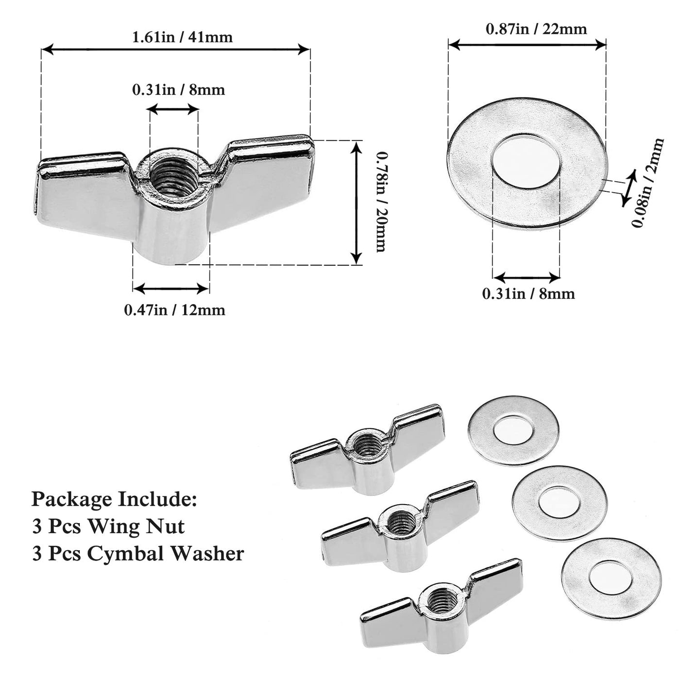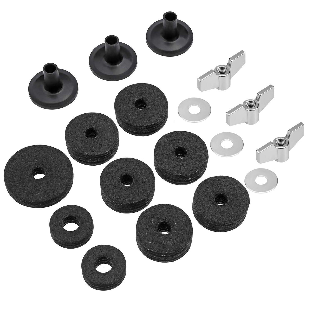 Description All The Wing Nuts Are Made Of High Quality Stainless Steel, All The Cymbal Felts Are Made Of Quality Fibre-Optic Felt Which Are Designed To Last Longer And Provide Better Protection For Your Cymbals. High Quality Felts: All Pieces Are Made Of Quality Fibre-Optic Felt Which Are Designed To Last Longer And Provide Better Protection For Your Cymbals. Smooth Fitting Sleeves: Ensure That Your Cymbals Are Perfectly Positioned At The Optimum Height In Order To Allow Complete Control Of Setting Up Your Drum Set And Delivering Good Performance. And They Can Be Trimmed To Size And Adjusted Accordingly To Fit Cymbal Stand Diameter. Protects Cymbals From Becoming Scratched And Damaged Due To Metal To Metal Contact. Wing Bolts And Washers: They Can Help To Secure Your Cymbal And Felt Together Tightly, Making Sure You'Ll Never Miss A Beat (Or Cymbal) From Spinning Cymbal Problems. Constructed With Stainless Steel And Aluminium Core To Help Protect From Long Term Damage Or Rust. Specifications: Color: Black,Silver Material: Plastic, Felt, Metal Cost-Effective Drum Accessories Kit Package Includes: (Total 18 Pieces) 3 X Cymbal Sleeve With Base (8 - 10 Mm)&Nbsp; 6 X Cymbal Felt (8 - 10 Mm)&Nbsp; 2 X Hi-Hat Clutch Felt (6 - 8 Mm)&Nbsp; 1 X Hi Hat Cup Felt (6 - 8 Mm)&Nbsp; 3 X Wing Nut (8 Mm)&Nbsp; 3 X Washer (8 Mm)&Nbsp;