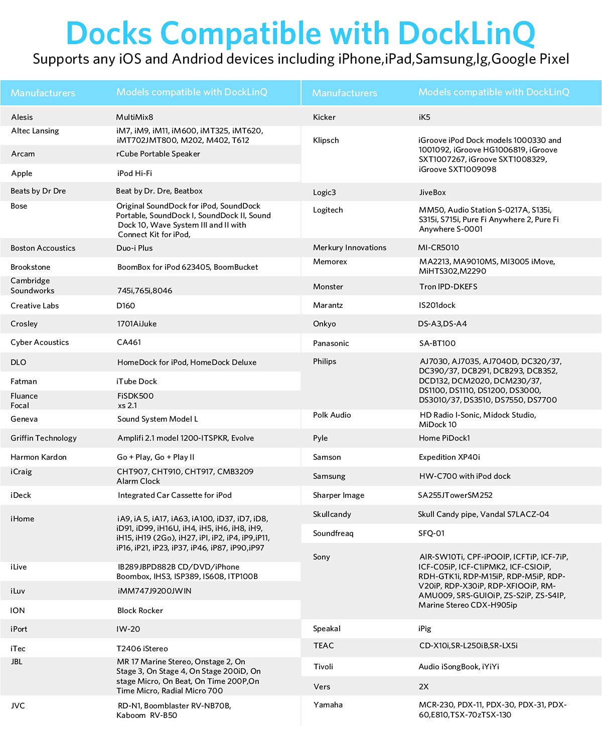 Q: What should I do if my dock is not compatible with the DockLinQ Pro?A: If your dock is not compatible with the DockLinQ Pro, it is recommended to refer to the product images for a compatibility check. For car iPod connectors, consider using Airdual, which is designed to support original steering wheel control and offers enhanced compatibility.