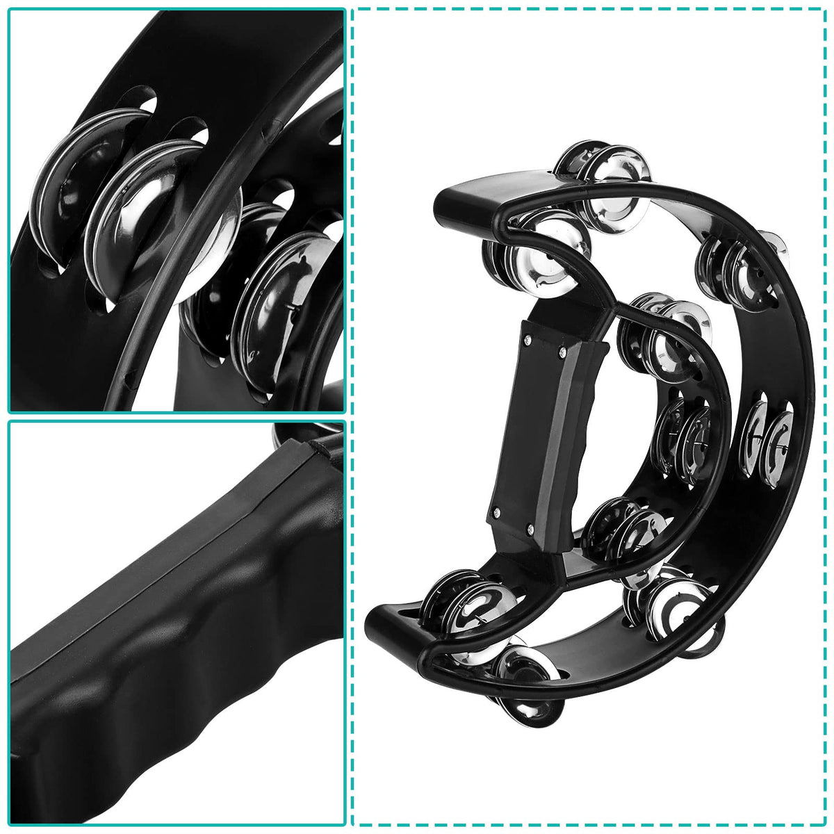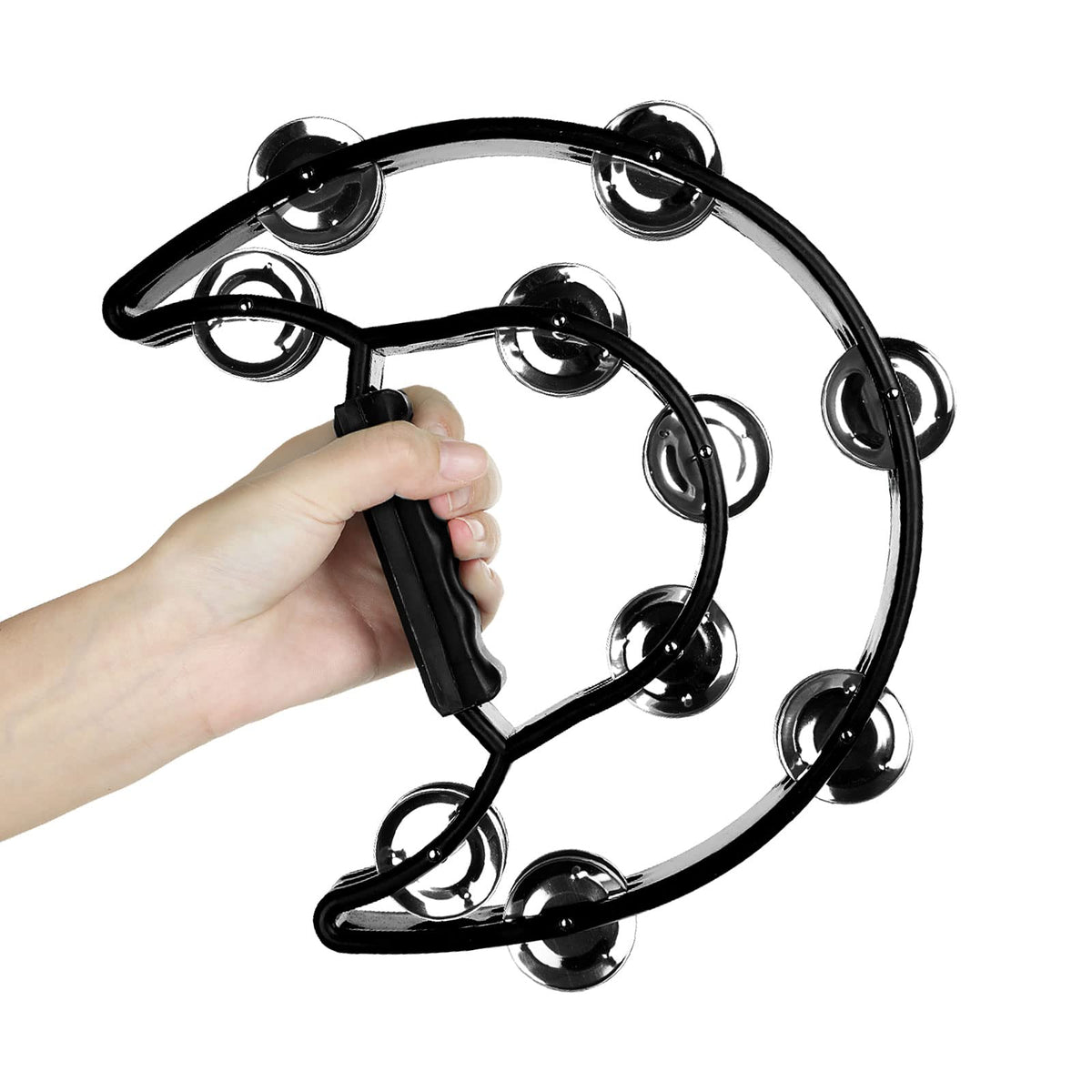 Eoexn 4 Pack 10'' Half Moon Musical Tambourine Black Metal Jingles Hand Held Percussion Drum Double Row, Plastic Musical Percu