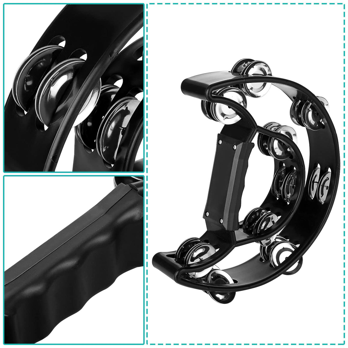 This Music Tambourine Is One Fun Instrument The Plastic Half-Moon Shape Features 20 Jingles It Is Professional Size And Also Features A Rubber Comfort Grip Handle For An Easy Grip These Double Row Musical Tambourine Make A Great Gift And Can Been Used In A Variety Of Settings, Including Bands, And Orchestras Grip Tambourine Found In Many Forms Of Music Including Classical, Persian, Gospel, And Rock The Gently Rocking Or Flapping The Drum Tink The Sound Of The Bell, Ringing Out Loud Add Much Fun To The Party, Dancing, Wedding, Concert, Games, Festival, Etc Specifications: Material: Plastic & Metal Color: Black Size: 25 X 22 Cm 98 X 87 Quantity: 4 Pack