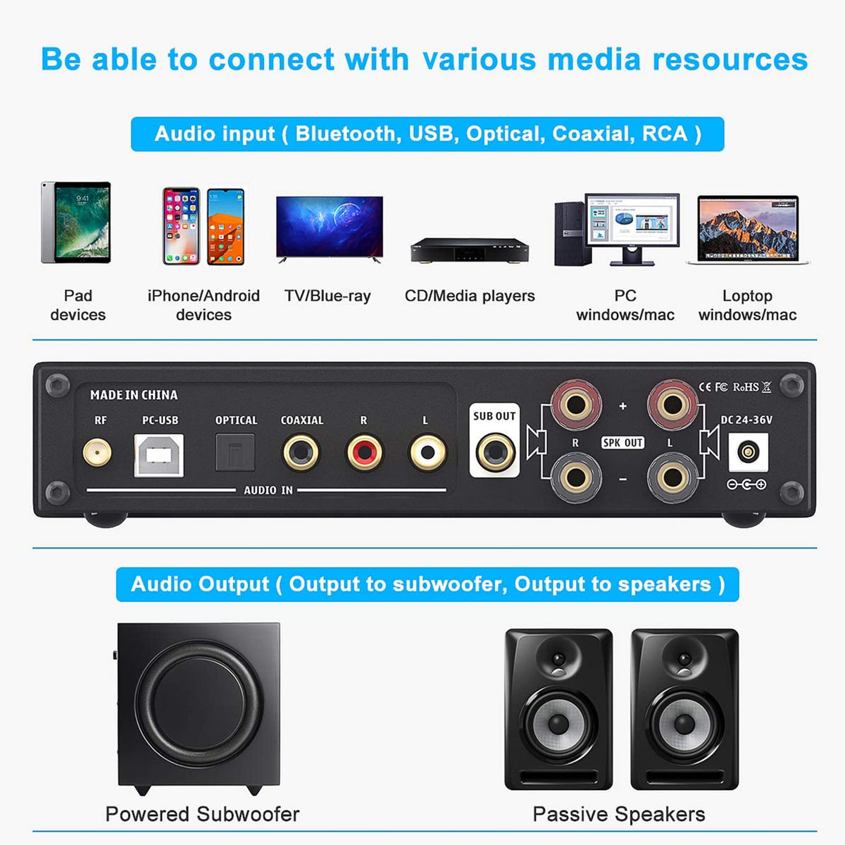 2.1 Ch Wireless Dac Hifi Amplifier With Eq Control. Max Power Output Up To 120Watts X2@4Ohm. Da2120C Can Drive Most Home Bookshelf/Desktop/Outdoor(Passive) Speakers And Powered Subwoofers, Offering Low Distortion And Acoustically Accurate Audio Reproduction. The Bright Digital Led Display Lets You See The Settings You Change Easily And Remote Control For Hassle-Free Adjust The Inputs Mode/Volume/Bass/Treble. Da2120C High-Performance Integrated Stereo Digital Amplifier Adopts Texas Instruments Tas5352A Chip, Designed To Drive A 4-O Bridge-Tied Load (Btl) At Up To 125 W Per Channel With Low Harmonic Distortion, Low Integrated Noise, And Low Idle Current. The Tas5352A Has A Complete Protection System Integrated Into The Chip, Safeguarding The Device Against A Wide Range Of Fault Conditions That Could Damage The System. 2-In-1 High-Performance Dac Power Amplifier With Multiple Input Modes. Da2120C Installed In A Quality Aluminum Enclosure Support Bluetooth/Rca/Pc-Usb/Coaxial/Optical Input, Easy Installation To Build A Stereo Sound System. Da2120C Bluetooth 5.0 Amplifier Delivers Sound In Sync, So You Can Enjoy The Freedom Of Wireless And High-Fidelity Streaming Music. It Reduces Delay And Improves The End-To-End Speed Of The Audio Transmission, Resulting In High-Quality, Synchronized Sound, So You Never Miss A Beat. With A 6Dbi High Gain Antenna For Long-Range Streaming Up To 65 Ft(20M).