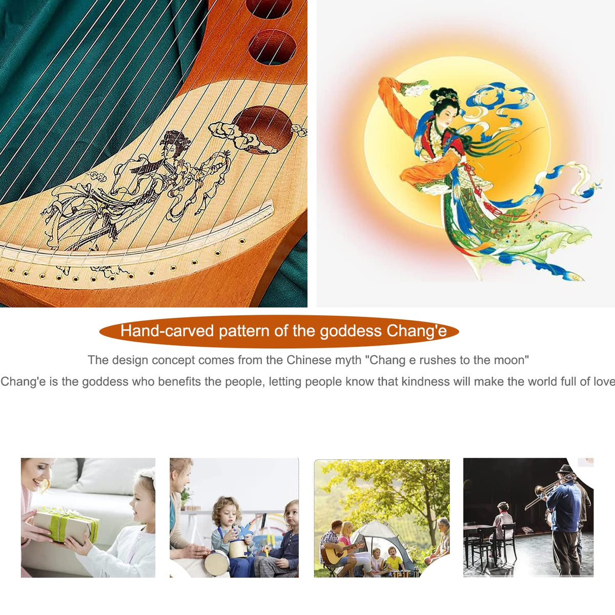 ---- Used For Early Education Of Childrens Music, Open Up Childrens Senses, Improve Concentration, Listening Skills, And Interpersonal Interaction Skills ---- Used For Music Performance, It Is A Classic Instrument That Nourishes The Senses And Soul ---- Used For Music Healing, To Bring Comfort And Help People Release Stress And Regulate Emotions --- Product Datial Name: Lyre Harp Stringed Instrument Autoharps Color: Brown Number Of Strings: 16 String Overall Material: Mahogany + Grade A Spruce String Material: Steel Packing List: Harp*1, Accessories Applicable Scenes: Gifts, Concert Halls, Performances, Parties, Travel, Cafes Applicable People: Men, Women, Children, Professionals, Beginners, Musical Instrument Lovers Ote: 1 We Only Sell Instrument, Others Are Props 2 Due To The Use Of Different Shooting Tools, Slight Color Errors May Occur Please Refer To The Actual Product 3 Due To Manual Measurement, Please Allow 1-3Cm Deviation, Please Refer To The Actual Product