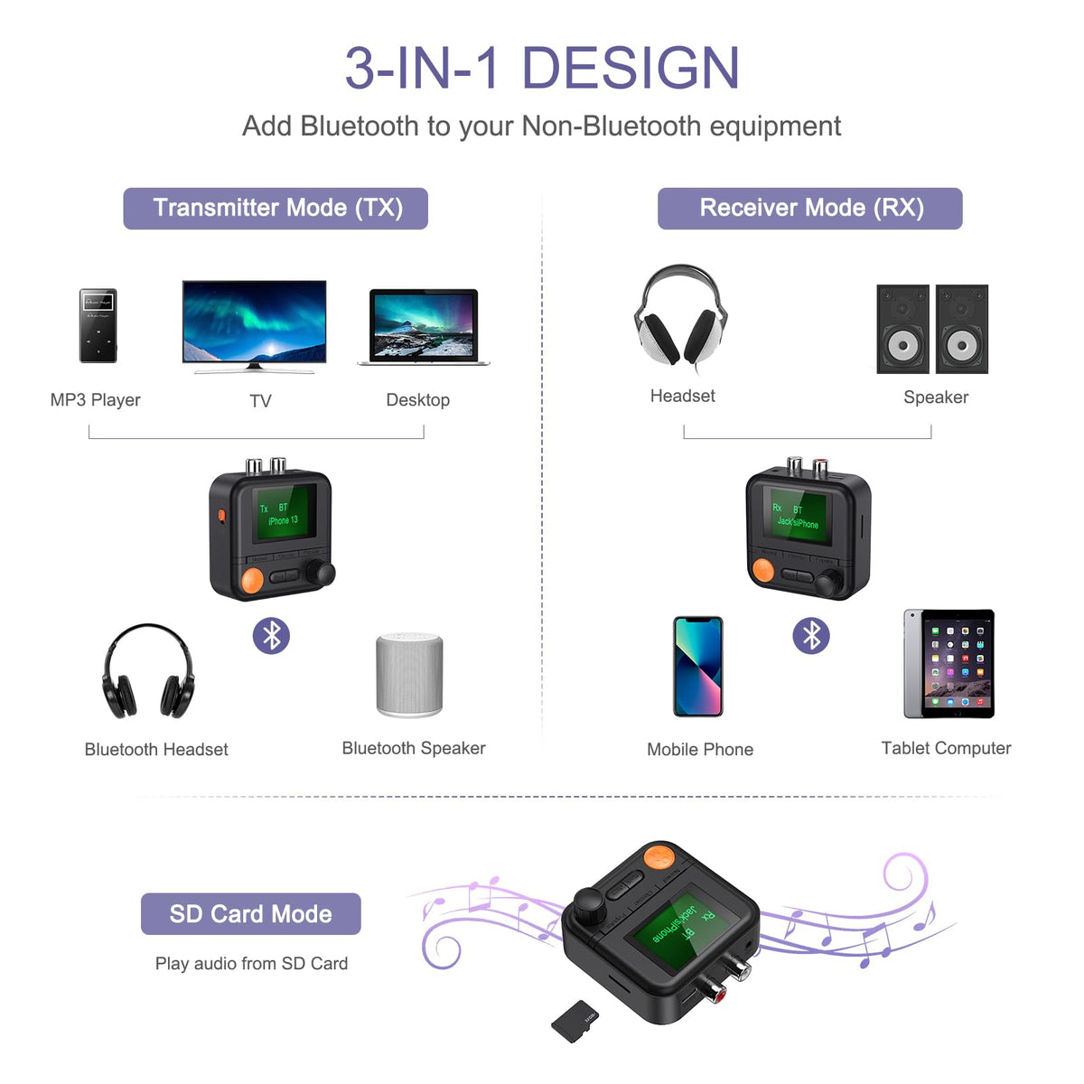Jxtz 2-In-1 Bluetooth Transmitter Receiver Features: Bluetooth Version: V5.2 Working Range: 33Ft Clear Display Screen: It Can Display The Name Of The Searched Bluetooth Devices, Can Help You Better Pairing. Support: Rca, 3.5Mmaux Audio Output, Tf Card Play(Max 32Gb). Plug And Play: No Any Driver Requires. It Is Easy To Pair, Wide Compatibility: Support Audio Music Streaming Sound System, Tv, Home Stereo, Car Stereo, Speakers, Headphones, Earbuds, Etc. Package Includes: 1*Bluetooth Adapter 1*Aux Auxiliary Output Cable 1*Rca Connection Cable 1*Data Cable 1*English Manual