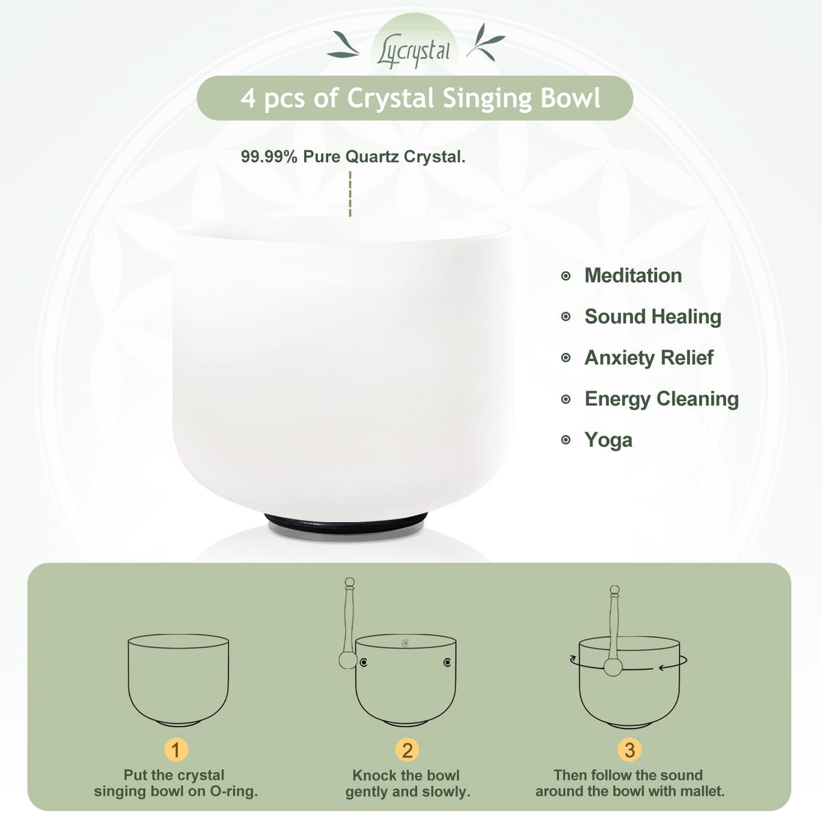 Lycrystal Singing Bowl Set Of 4 Pcs 6'' A Note 8'' F Note 10'' G Note 12'' C Note Frosted Chakra Quartz Crystal Sound Bowls With