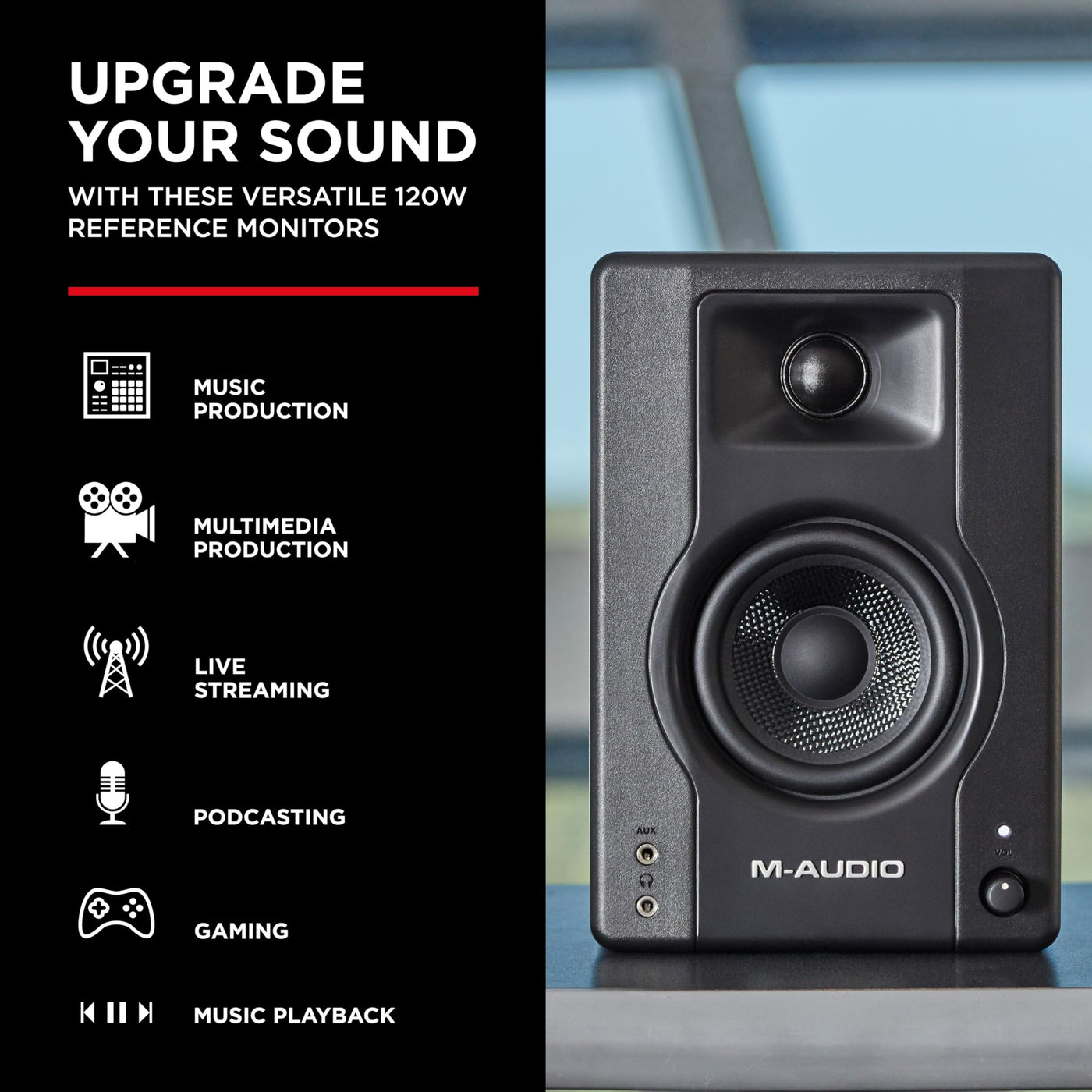 Upgrade Your Desktop Speaker Sound With Bx4S Studio Monitor Quality Are You Unhappy With The Sound Quality Of Your Built-In Computer Speakers? The M-Audio Bx4 Speakers Are The Perfect Choice! Compact, Attractive And Simple-To-Install, M-Audios Bx4 Desktop Speakers Have Been Meticulously Created For You To Experience Your Media Like Never Before! Immersive Listening Experience Designed For Live Streaming, Podcasting, Gaming, Watching Movies Or Listening To Your Favorite Music, M-Audios Bx4 Speakers Provide And Impressive 120 Watts Of Crystal-Clear Sound Inside An Attractive, Style-Driven Design. The Two-Way Desktop Speaker Design Features An Acoustically-Inert Mdf Cabinet With Bass Reflex That Facilitates A Smooth Low End And Punch Through The Kevlar Low Frequency Drivers. Plus, The Enhanced Rear Ports Add Extended Low-Frequency Response Making Any Videogame, Movie Or Song You Play A Truly Immersive Experience. Add To This, The Computer-Optimized Natural Silk Dome Tweeters For A Crystal Clear High-End And Precise Stereo Image, And The Bx4 Delivers Pristine Sound Quality Perfect For Any Multimedia Application. Perfect Connections The Rear Panel Connections Offer 1/4 , 1/8 , And Rca Inputs Making Them Compatible With All Your Gear. There Is Even An 1/8-Inch Aux Input And Headphone Connection On The Front Of The Speaker For Your Tablet, Computer, Or Mobile Device. Whats In The Box Bx4 Speakers (Stereo Pair: 1 Passive Speaker And 1 Active Speaker) Foam Feet 2-Prong Iec Power Cable 1/8 Ts Speaker Interconnect Cable 1/8 To 1/8 Trs Aux Cable 1/8 Trs To Rca Cable User Guide Safety & Warranty Manual.