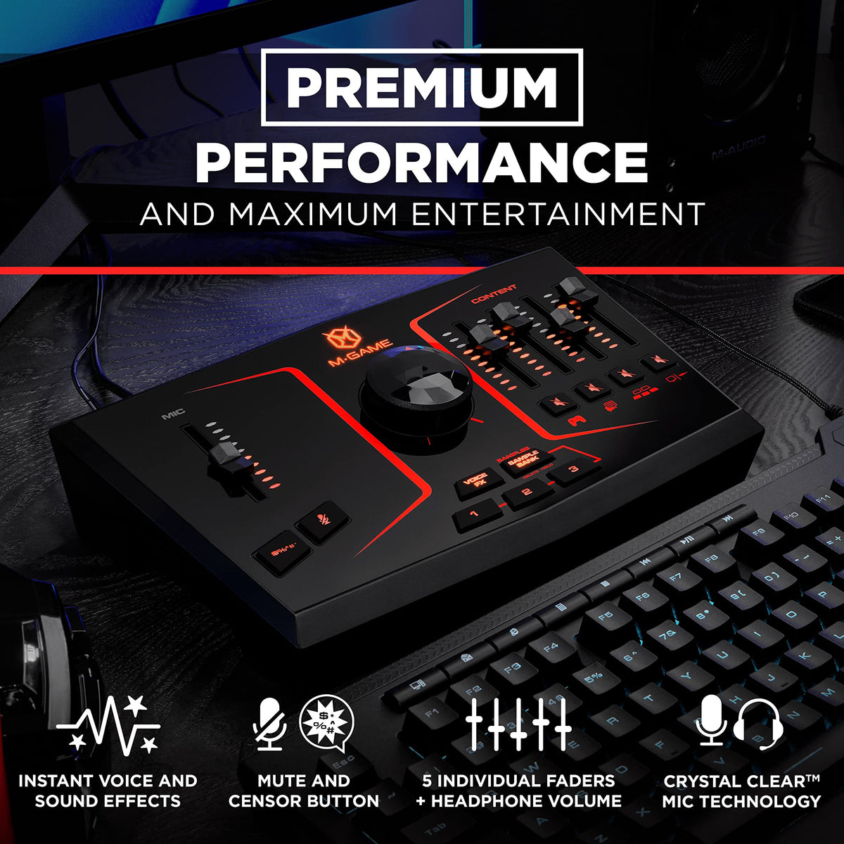 The M-Game Solo Is A Usb Livestreaming Mixer With Customizable Led Lighting, Sampler, And Voice Shaping And Effects Combined With A Professional Audio Interface And Physical Mixing Control Surface With M-Game Solo You Can Easily Create An Entertaining And Customizable Livestreaming Set-Up With Tools At Your Fingertips That Will Enhance Your Gaming Experience And Wow Your Audience The M- Game Solo Usb Streaming Mixer Is The Ultimate Usb Audio Interface Combined With M-Game Software For Superior Streaming And Content Creation This Versatile Livestreaming Mixer Offers Connections For All Your Equipment And Ultimate Mix Control Of Your Livestream Connect Any Microphone To Our M-Audio Crystal Mic Preamp Circuitry For Broadcast Level Quality Of Your Voice A Usb Connection For Your Pc And Optical In For Consoles Provides Flexible Gaming And Streaming Connectivity Plus, An 18A Stereo Input Is Available For Any Additional Audio Devices Such As Phones And Tablets And A Footswitch Can Be Used For Additional Control Of M-Game Controls Or Your Favorite Software Shortcuts And Hotkeys Use The 5 Physical Faders For Real-Time Mixing Of Your Voice, Chat, Game, Pc Audio And Sampler, And More Right To Your Stream The Large Center Control Knob Provides Instant Control Of Your Headphones, Headset, Or Speakers Take Full Control Over Your Gaming Experience And Provide Maximum Entertainment To Your Audience