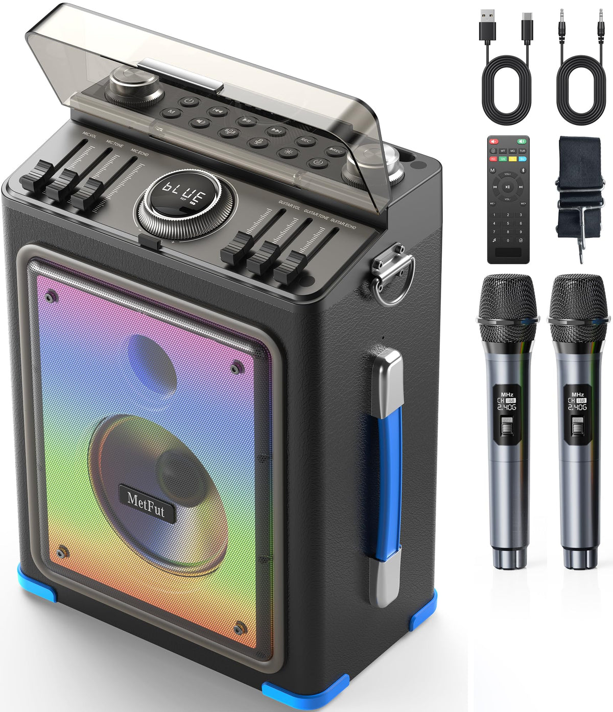 Metfut Karaoke Machine&Nbsp; Premium Wooden Karaoke Speaker - Splash-Resistant Outdoor Sound System Sing Through The Weather Take Your Karaoke Parties Outdoors Without Worry! Our Splash-Resistant Wooden Karaoke Machine Handles Light Rain And Poolside Splashes, So You Can Keep Singing Through Summer Drizzles. No More Canceled Backyard Concerts! Big Sound, Natural Warmth The Solid Wood Acoustic Chamber Delivers Richer Bass And Clearer Vocals Than Plastic Speakers. With A 40W High-Power Driver And Precision-Tuned Eq (Adjustable Bass/Treble/Echo), Experience Studio-Quality Sound That Turns Your Patio Into A Stage. Made For Outdoor Fun ? 12-Hour Playtime - Dual 9,000Mah Batteries (Charge While Playing) ? True Wireless Stereo (Tws)-Pair 2&Nbsp; Karaoke Speakers For 360 Party Sound ? All-In-One Connectivity-Bluetooth 5.3, Usb, Aux, Microsd ? Dual Wireless Mics - Zero-Latency Singing (Batteries Not Included) ? Dynamic Led Lights - Auto-Sync To Music Or Set A Static Color Perfect For:&Nbsp; Backyard Bbqs Pool Parties Camping Trips Tailgating Tech Specs: Water Resistance: Splash-Proof, Not Submersible Driver: 5.8 Woofer + 2 Tweeter Battery: 2X 9,000 Mah (12 Hrs At 70% Volume) Inputs: Mic, Guitar, Aux, Usb, Microsd (Up To 64Gb) Whats Included: 1X Karaoke Speaker 2X Wireless Microphones (Aa Batteries Not Included) 1X Aux Cable 1X Charge Cable-Type C 1X Quick Start Guide Note: For Best Waterproof Performance, Avoid Heavy Rain Or Submersion. Why Buy? ? Better Than Plastic - Wooden Housing For Deeper, Warmer Sound ? No Dead Batteries - Play+Charge Keeps Music Going ? Party-Ready Extras - Led Lights, Wireless Mics, And Tws Pairing ? Water Resistance - Sing Worry-Free In Light Rain Or Near Pools