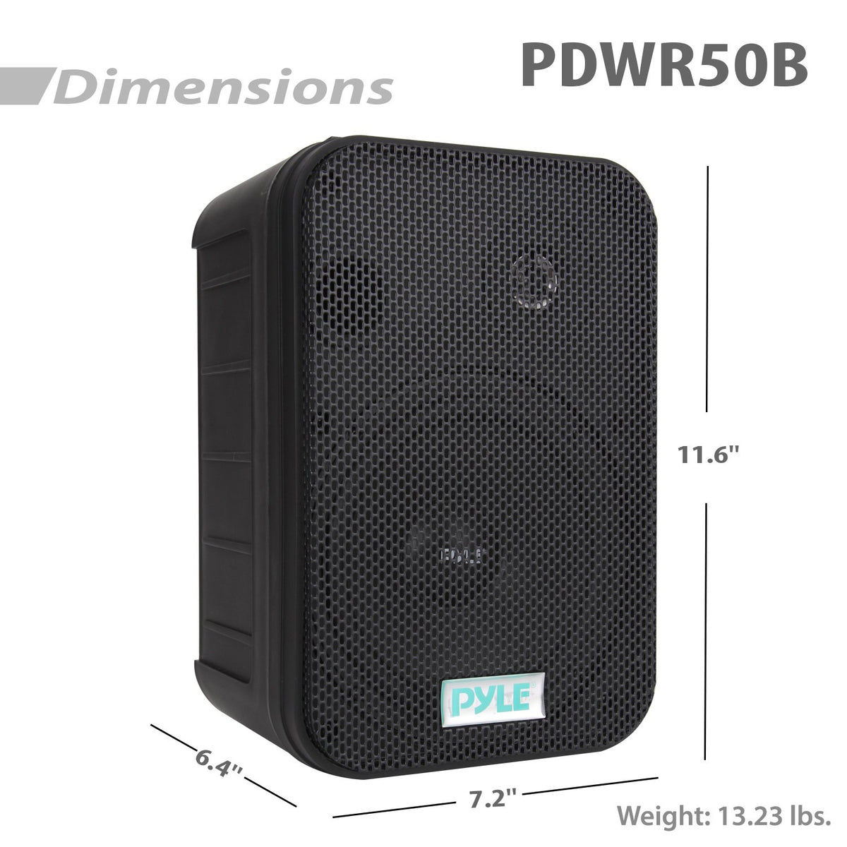 Pylehome Model : Pdwr50B6.5'' Indoor/Outdoor Waterproof Speakers6.5'' Indoor/Outdoor Waterproof Speakers (Black)Excellent For Use On Boats/ Marine/ Decks/ Patios/Poolside/ Outdoors Completely Water Proof 6.5'' Aluminum Injection Cone Woofer 50 Oz. Magnet Structure 1'' High Compliance Myiar Tweeter Capacitor Crossover Network Bass Reflex Vent For Added Bass Response Heavy Duty Abs Construction Quick Connect/ Disconnect Speaker Terminals Unique Spring Loaded Mounting System Removable Rustproof Mesh Grills Power: 250Watts Rms/ 500Watts Peak Frequency Response: 30Hz-22Khz Impedance: 4 Ohms Dimensions: 7.2''(W)X 11.6''(H) X 6.4''(D)These Black Pyle Indoor/Outdoor Waterproof Speakers Are Excellent For Use On Boats, Decks, Patios, Or By The Pool - Anywhere Outdoors. They'Re Completely Waterproof, Thanks To The Heavy Duty Abs Construction. And They'Re Powerful - 500 Watts Max. A 6.5' Aluminum Injection Cone Woofer Provides The Midbass, While A 1' High Compliance Mylar Tweeter Pushes Sweet Highs. A Capacitor Crossover Network Separates These Two Channels Discretely For A Brilliant Sound. Connect Wires Easily And Effortlessly Using The Quick Connect Speaker Terminals. The Bass Reflex Vent Boosts The Bass Response For A Deeper, More Powerful Sound, Ultimately Delivering A Frequency Response Of 30 Hz To 22 Khz. Mount Using The Unique Spring Loaded Mounting System. The Mesh Grills Are Rustproof And Removable. Sold As A Pair.