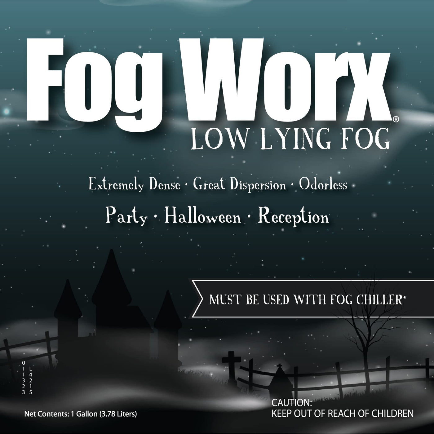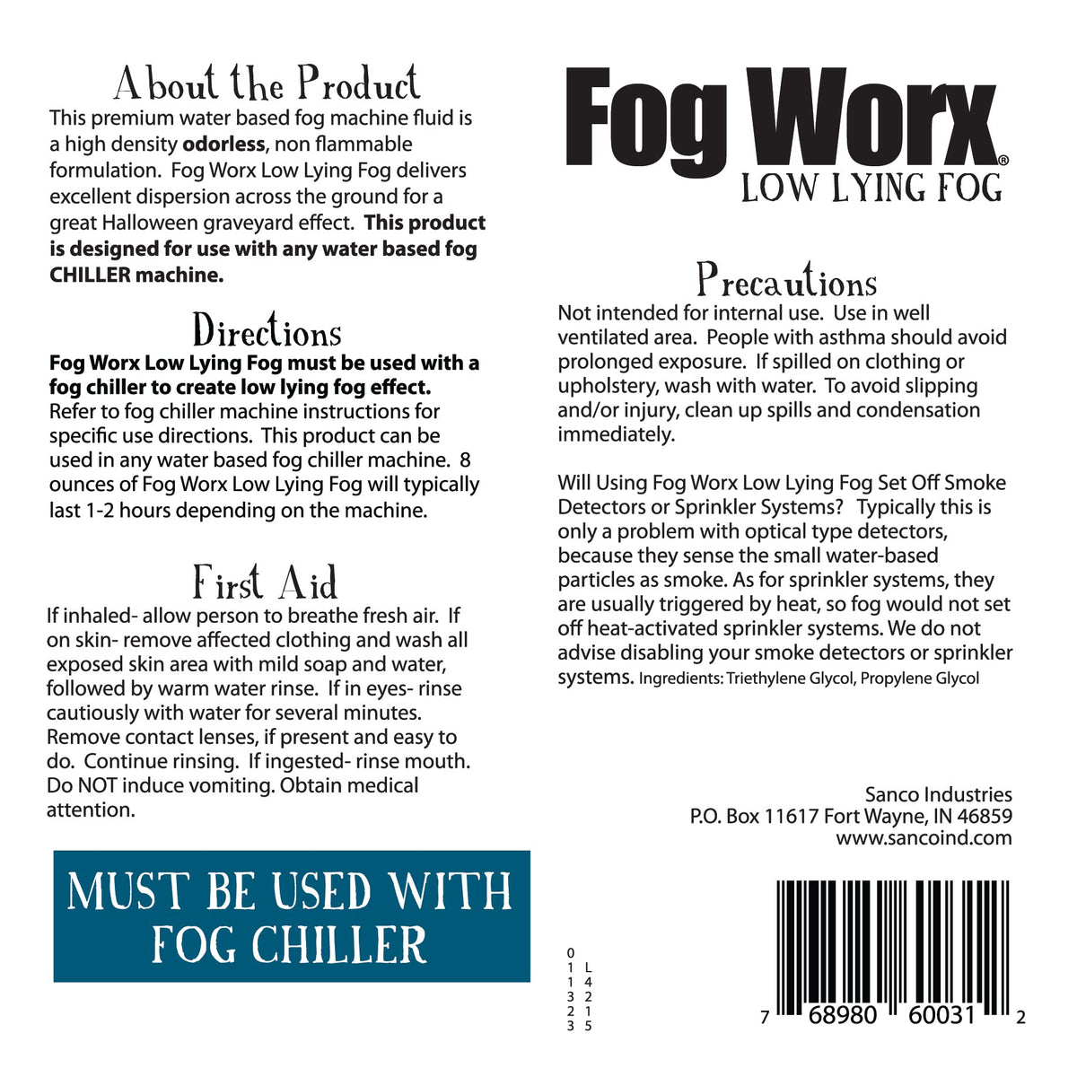 This Premium Water Based Fog Machine Fluid Is A High Density Odorless, Non-Irritating, Non-Toxic, Non-Flammable Formulation Fog Worx Low Lying Fog Delivers Excellent Dispersion Across The Ground For A Great Halloween Graveyard Effect This Product Is Designed For Use With Any Water Based Fog Chiller Machine 8 Ounces Of Fog Worx Low Lying Will Typically Last 1-2 Hours Depending On Machine