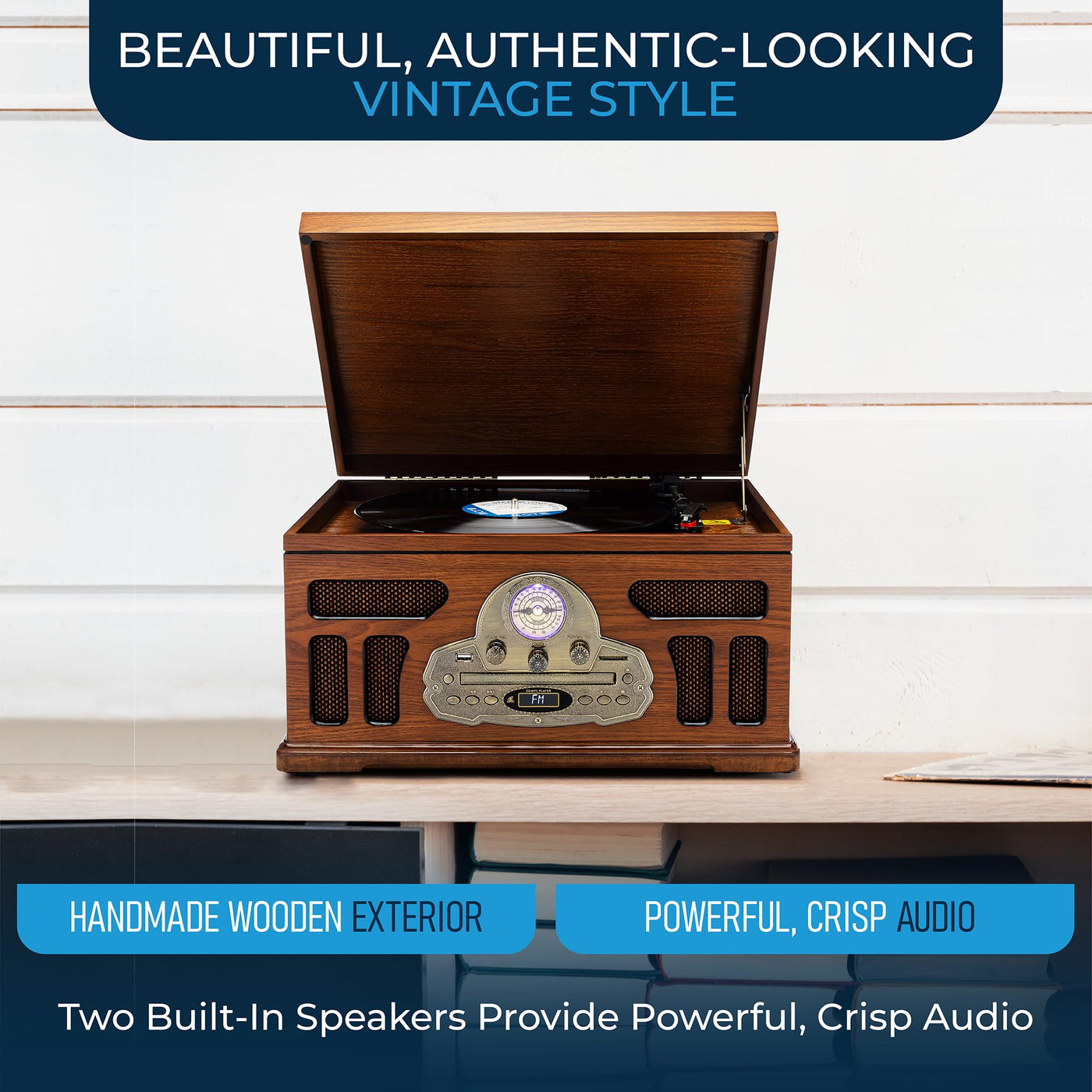 Introducing The Soundbeast All-In-One Vintage-Style Turntable. This Audio Stereo System Is The Perfect Combination Of A Beautiful Style With A Modern, High-Caliber Audio Experience. The Turntable'S Handmade Exterior Is Made Out Of Real Wood And Features An Authentic-Looking Vintage Look. There'S Something For Everyone In This Record Player, Because There Are 6 Ways To Play Music: Turntable (3-Speed: 33/45/78 Rpm) Bluetooth Cd Player Cassette Tape Player Am/Fm Radio Usb Playback You Can Also Digitize Your Music Using This Device. It Can Record Digital Audio Files Using The Usb Encoding Feature (Usb Flash Drive Required, 64Gb Or Less; Not Included). Product Specifications: Dimensions: 17'' Width X 13'' Height X 9.3'' Length Weight: Approximately 15 Lb Power: 110V-120V North American Power Plug Only (For International Customers: 220V To 110V Step-Down Voltage Converter Required)