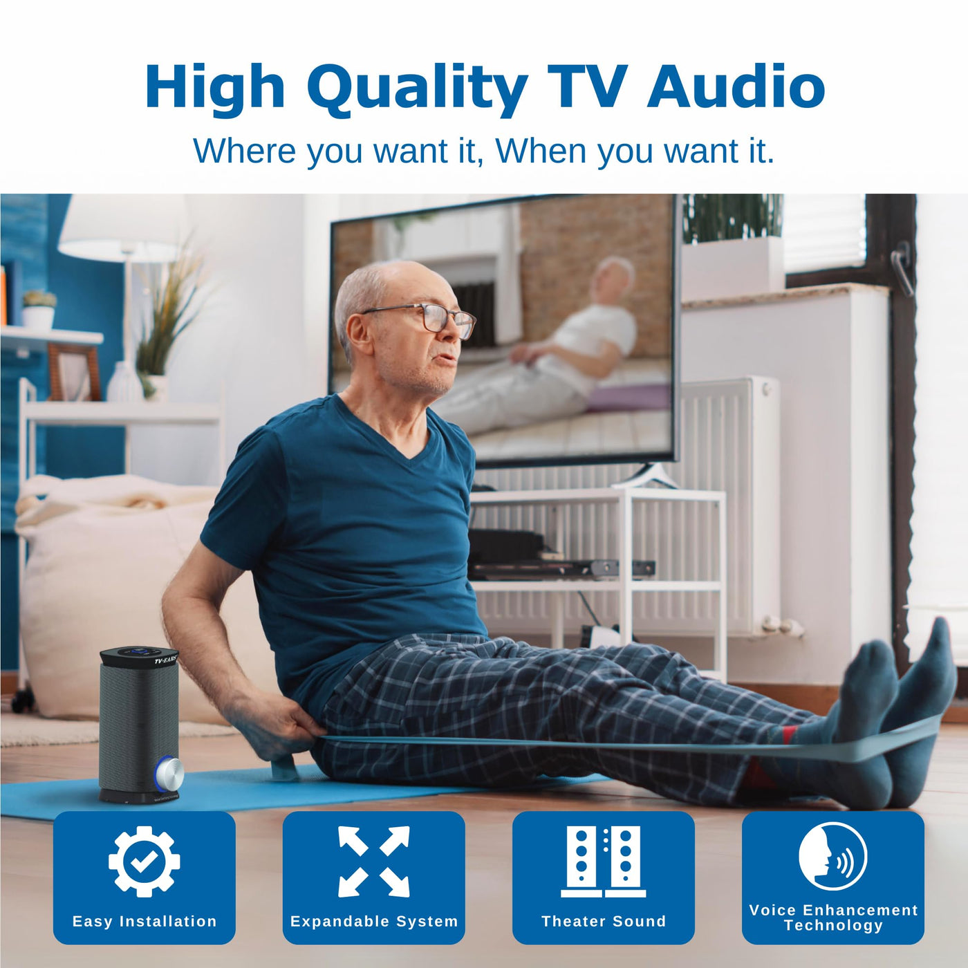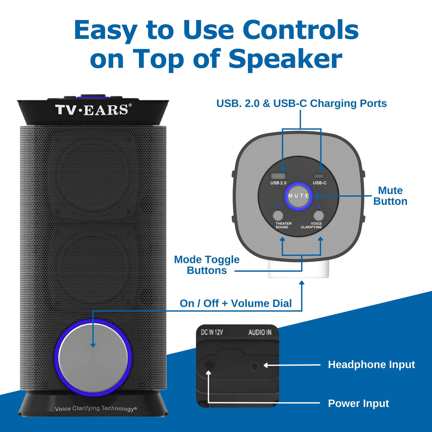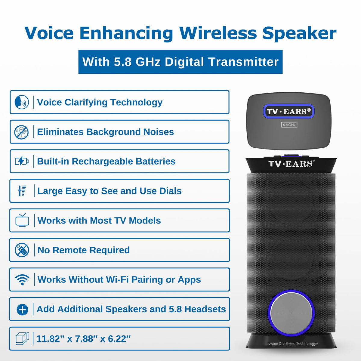 Improve Tv Sound Quality: Tv Ears Wireless Tv Speaker Delivers Clear Audio Right To Your Side, Avoiding The Need To Blast The Volume Across The Room. Ideal For Those Using Tv Speakers For The Hard Of Hearing Or Seeking A Wireless Tv Listening Device. | Voice Clarity Amplified: Elevate Your Tv Audio Experience With Tv Ears And Our Cutting-Edge Voice Clarifying Technology. Designed For Hard Of Hearing Individuals, This Wireless Speaker System Minimizes Background Noise, Delivering Crystal-Clear Sound. | Intuitive Tv Ears Control For Enhanced Audio: Effortlessly Manage Your Tv Sound With Tv Ears. A Large Volume Control Knob And 2 Modes (Theater Sounds/Voice Clarifying) Make Audio Adjustments A Breeze. Mute Or Modify Settings With Ease. | Instant Plug N' Play Setup - No Fuss, All Sound: Experience Tv Ears' Hassle-Free Installation. Within Minutes, Enjoy Amplified Tv Audio Without Grappling With Wifi, Apps, Pairing, Or Bluetooth Intricacies. | Seamless Universal Connectivity: Achieve Effortless Compatibility With Any Tv, Including Smart Models. Connect To Your Television Through Rca, 3.5Mm, Optical Digital, Or Coaxial, Ensuring A Straightforward Setup For Top-Quality Audio Enhancement.