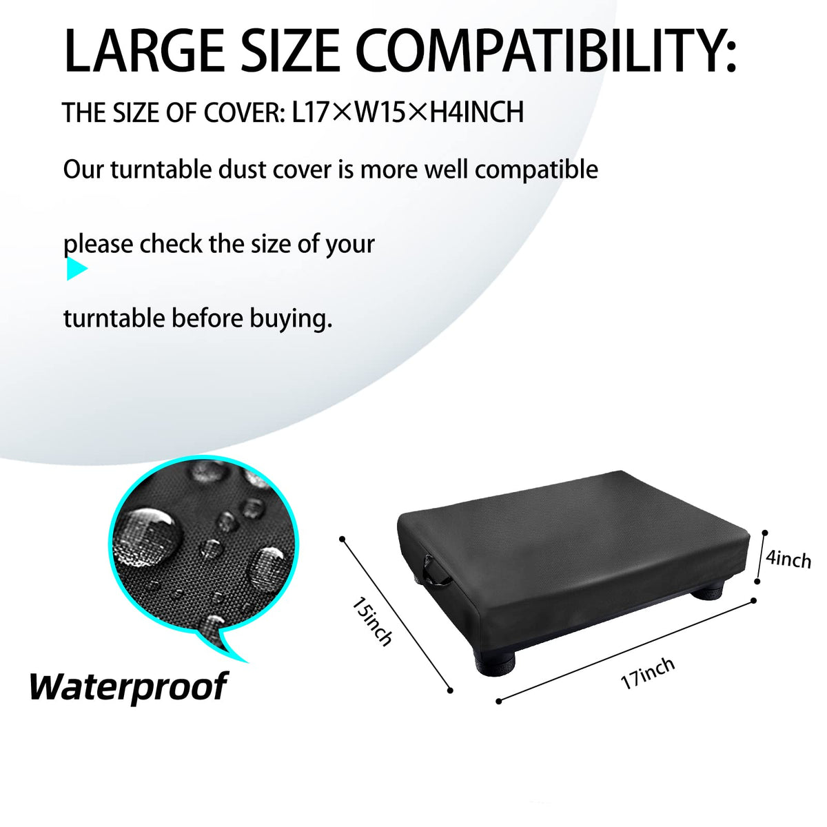 Q: What are the dimensions of the turntable dust cover?A: The dimensions of the turntable dust cover are 17 inches in length, 15 inches in width, and 4 inches in height, making it suitable for various models of turntables.