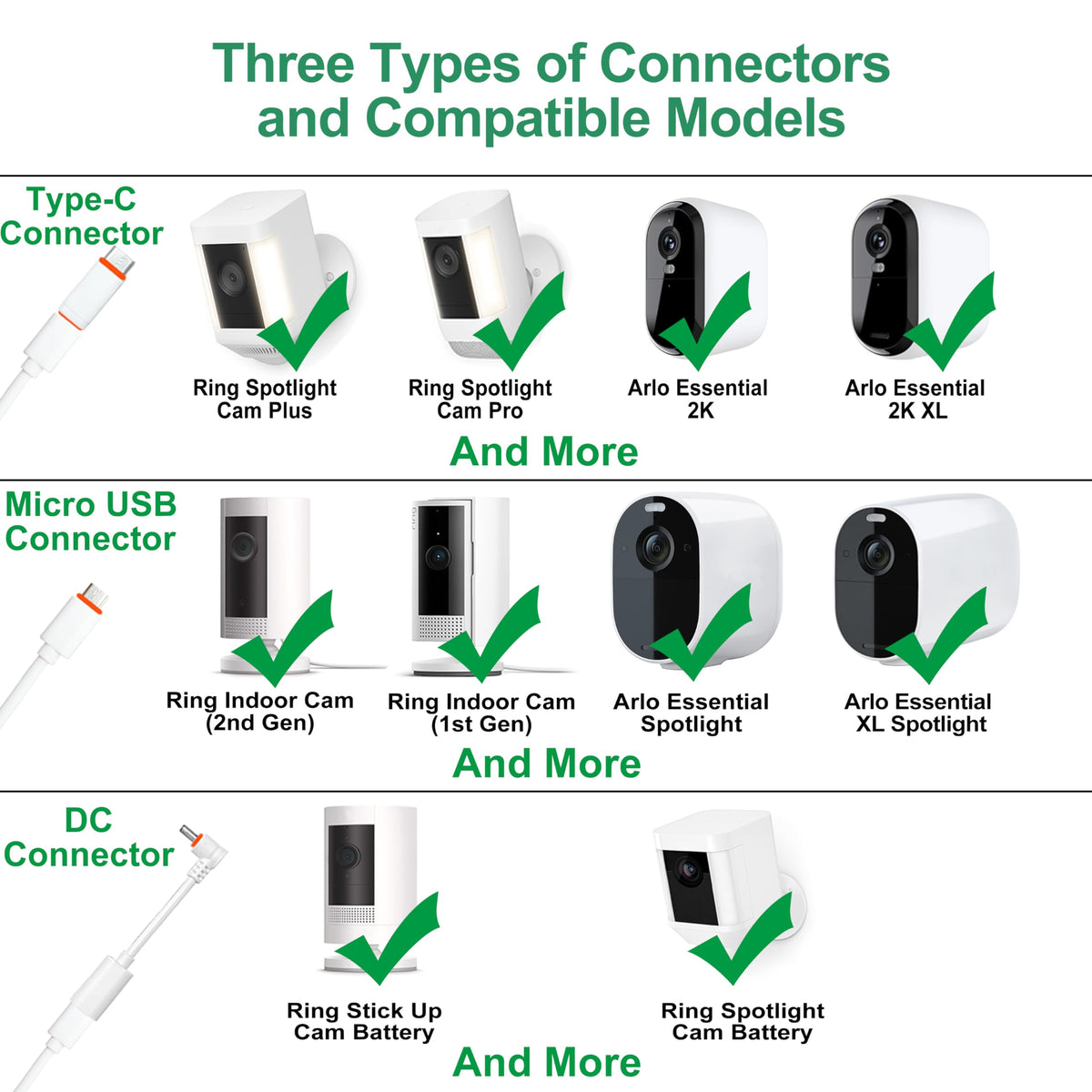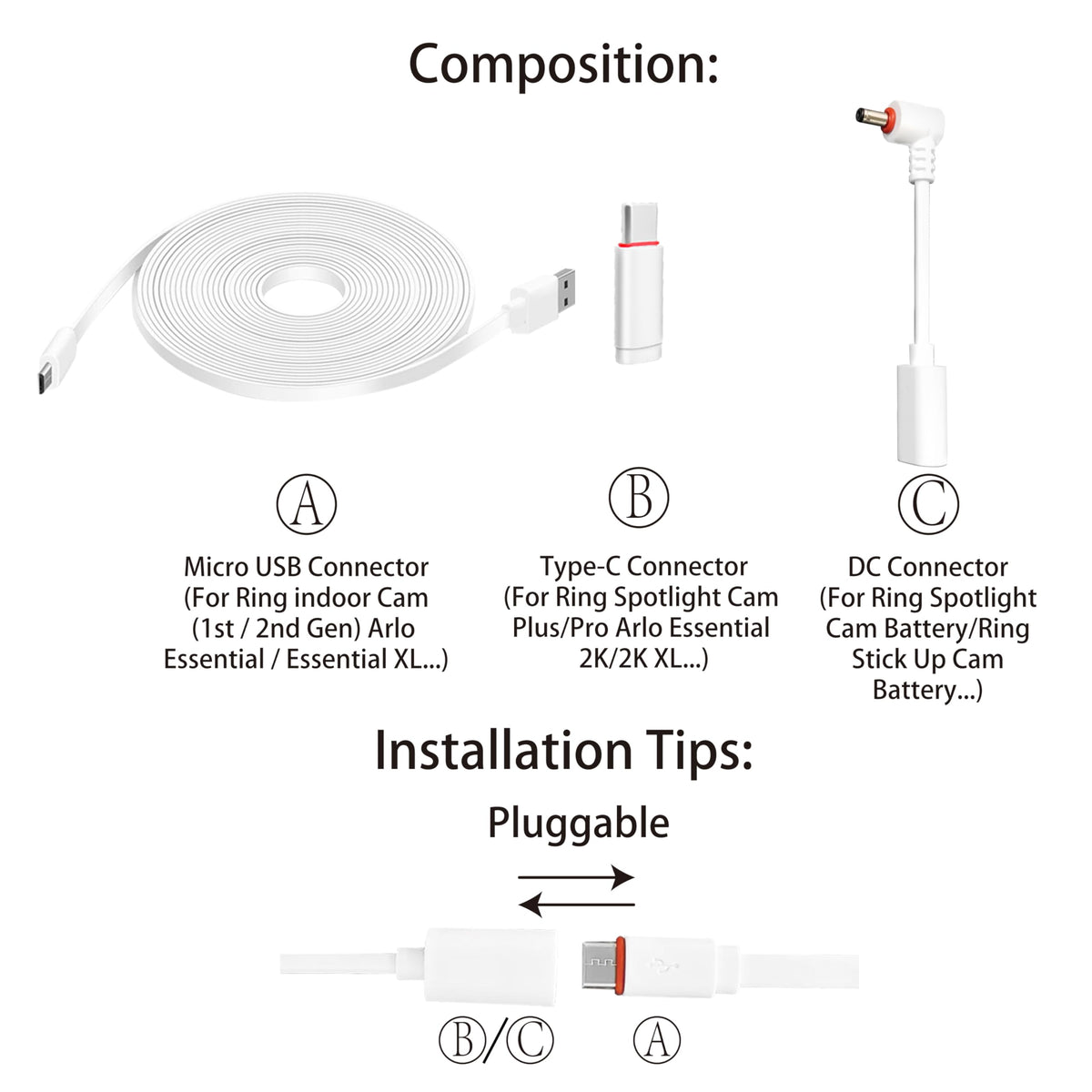 Ayiifei Power Extension Cord With Adapter, Compatible With All Ring Cameras, All Blink Cameras And Eufy Security Cameras, Weatherproof Charging Cable Plus Charger. Compatibility: Ring Camera: Ring Spotlight Cam Pro, Battery Ring Spotlight Cam Plus, Battery Ring Spotlight Cam Battery Ring Stick Up Cam Battery Ring Indoor Cam Simpliisafe Outdoor Camera Blink Camera: Blink Outdoor 4 (4Th Gen) Camera Blink Outdoor (3Rd Gen) Camera/Xt/Xt 2 Eufycam: Eufycam 3C Eufycam 2/2C/2 Pro/2C Pro/E Eufycam Solocam E20/Solocam E40 Product Advantages: This Cable Is Exceptionally Slim, Measuring Just 0.07 Inches In Thickness, Allowing It To Pass Through The Narrow Gapes Of Doors And Windows Effortlessly. With Gold-Plated Usb Connector Pins, This Product Offers Enhanced Durability, Longer Lifespan, And More Important, It Meets American Wire Gauge Standards. Package Include: 2 X 10Ft Extension Cable 2 X Dc 5V1A Adapter 12 X Cable Nails 10 X Adhesive Cable Clips&Nbsp; Reminder: This Package Does Not Include Any Cameras.&Nbsp; Please Note That This Power Cord Is Intended As A Replacement For An Existing Short Cord, Not As An Extension. Choose The Length Carefully To Meet Your Needs. Worry-Free Service: If You Encounter Any Issues, Please Contact Us, And We Will Resolve Your Concerns Promptly And Effectively.