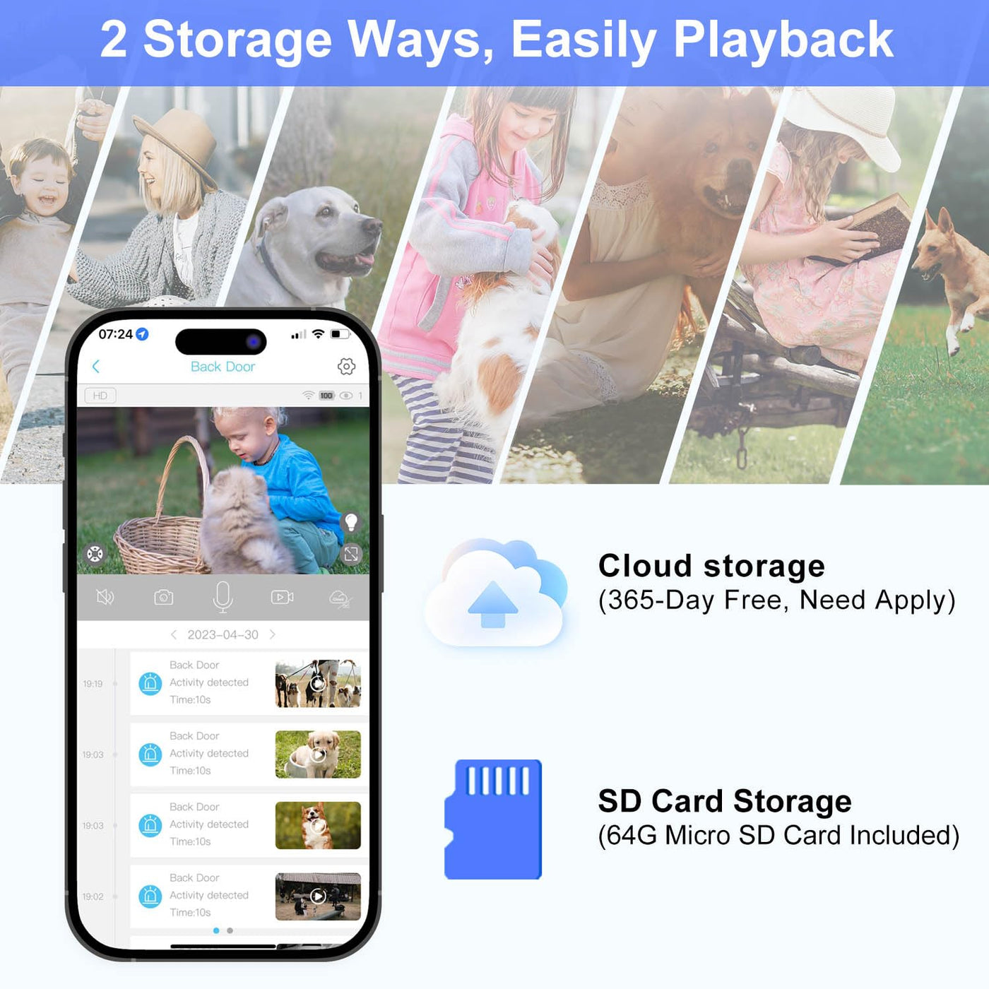 Q: Can I store recordings from the camera, and how does that work?A: Yes, the camera automatically saves encrypted recordings to a 64GB SD card (expandable up to 128GB) or to cloud storage when motion is detected.