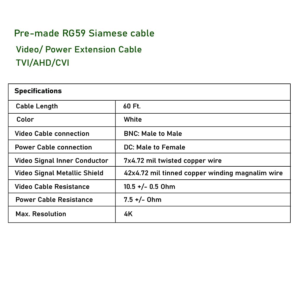 Acn-Siam60F- 60 Ft Pre-Made Rg59 Siamese Cable, Tvi/Ahd/Cvi - Cable Length: 60 Ft. - Color: White - Video Cable Connection: Bnc Male To Male - Power Cable Connection: Dc Male To Female - Video Signal Inner Conductor: 7X4.72 Mil Twisted Copper Wire - Video Signal Metallic Shield: 42X4.72 Mil Tinned Copper Winding Magnalim Wire - Video Cable Resistance: 10.5 +/- 0.5 Ohm - Power Cable Resistance: 7.5 +/- Ohm - Max. Resolution: 4K Cable