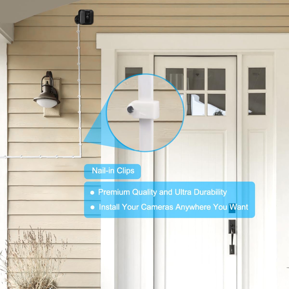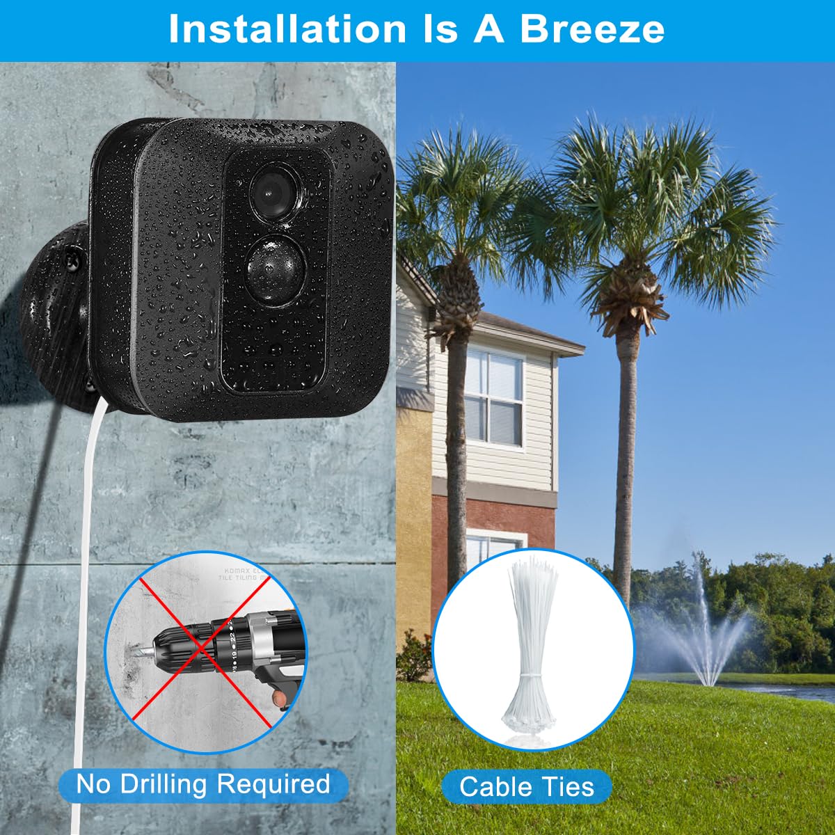 Q: What is included in the package with the Basesailor charging cable?A: The package includes a charger brick, a charging cable specifically for Blink XT camera series, cable ties for organization, and nail-in clips for easy installation.