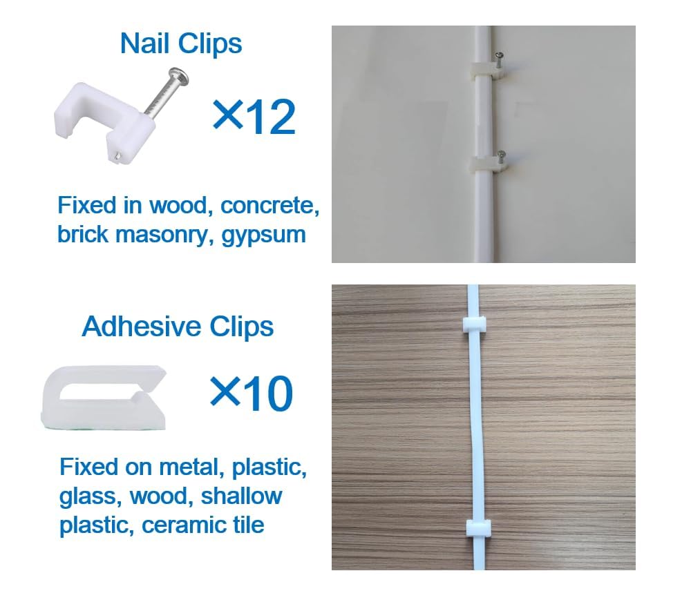 Q: What is included in the package?A: The package includes 2 x 26FT charging cables with Micro USB connectors, 2 x DC 5V1A adapters, 12 x wire clips, and 10 x adhesive cable clips for easy installation.