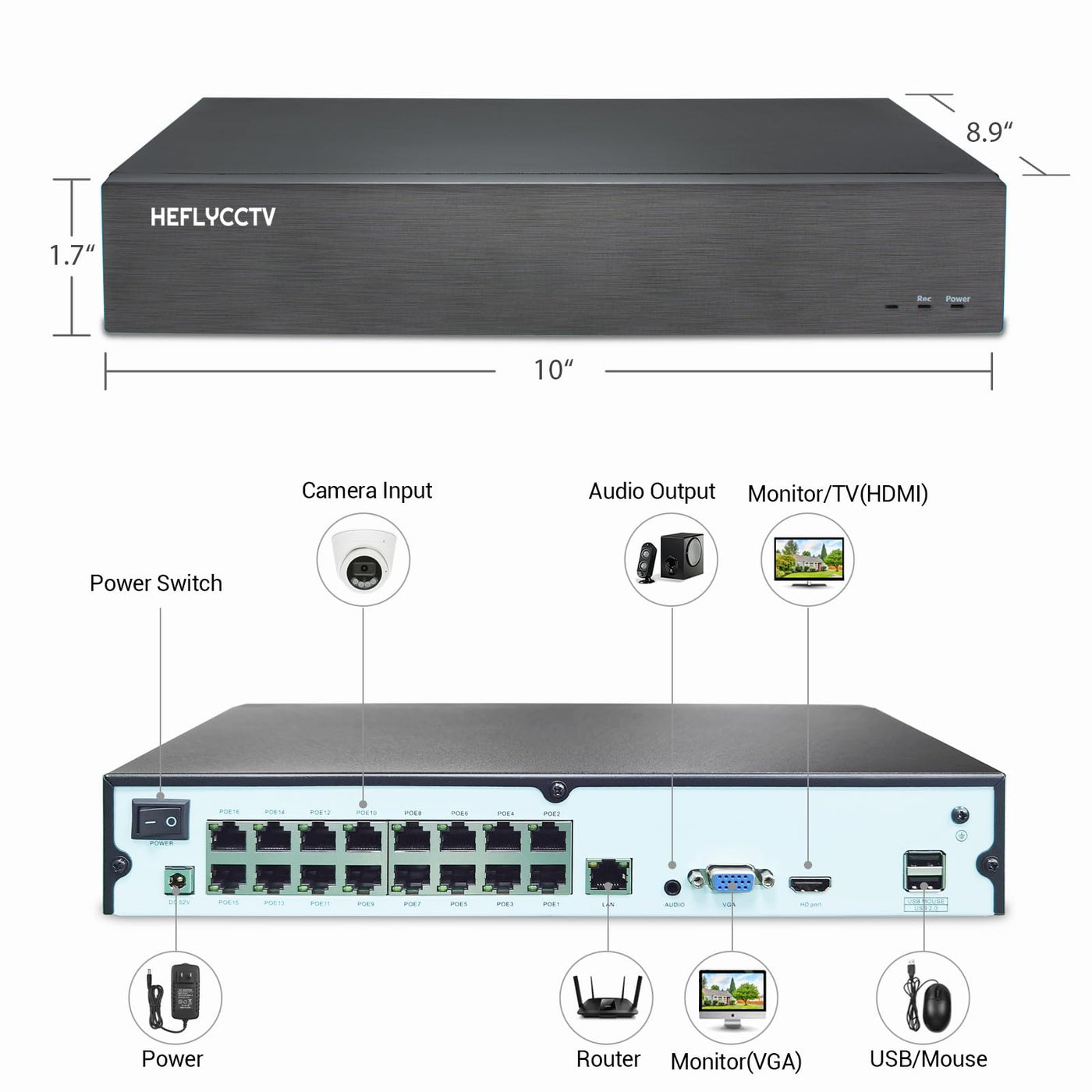 Heflycctv 16Ch 4K Nvr 16 Port Poe Network Video Recorder,Support 8Mp/5Mp/3Mp/2Mp/1080P Ip Poe Camera,Remote Access,Smart Human/V