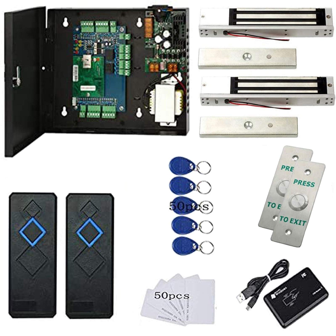 Mengqi Control 2 Door Access Control Panel System 600Lbs Waterproof Magnetic Lock Rfid Reader Metal Exit Button 110V Power Supply Box Usb Reader Rfid Card Key Fob Phone App Remotely Open Door