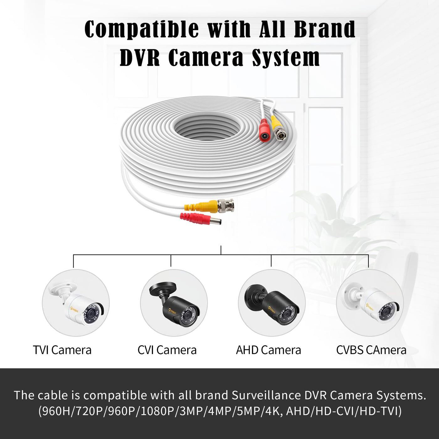 Q: What types of security cameras are compatible with the Omilik 50ft BNC Video Power Cable?A: The Omilik 50ft BNC Video Power Cable is compatible with all CCTV surveillance DVR camera systems, supporting a range of resolutions including 720P, 960H, 1080P, and up to 4K, making it ideal for various security camera setups.