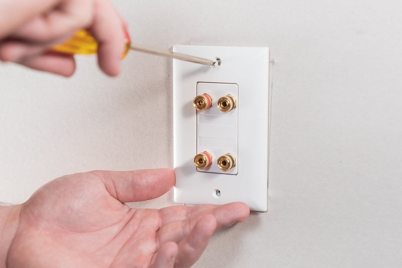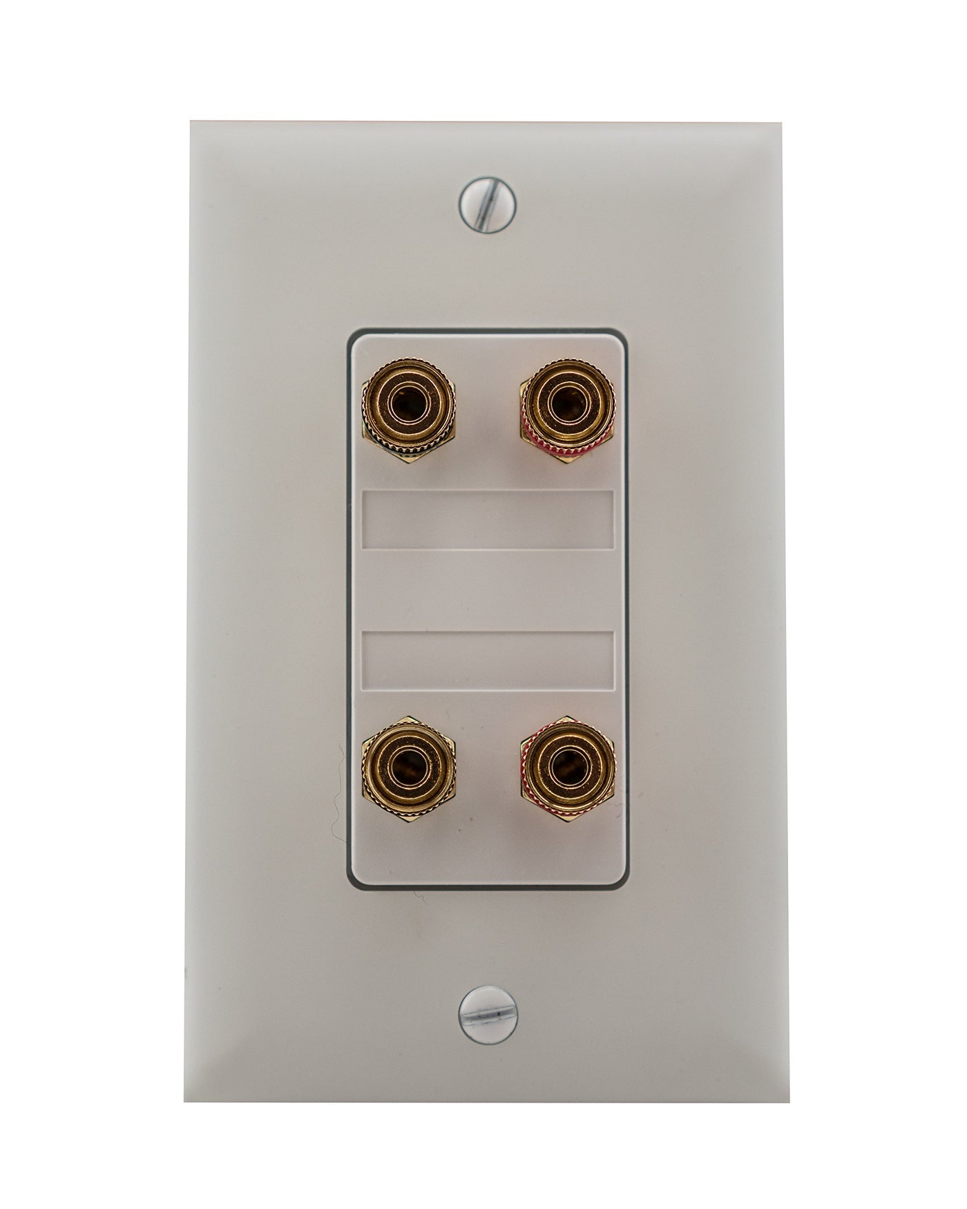 Q: How does the banana binding post work on the On-Q F9005WHV1?A: The banana binding post wall plate on the On-Q F9005WHV1 has two red (positive) and two black (negative) connections for two speaker setups, and it accepts both banana plugs and stripped speaker wire for easy installation.